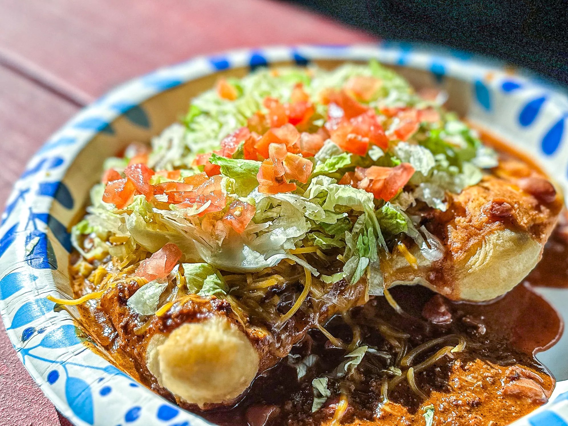 The object of the search — the Indian taco: frybread smothered in chili, beans and cheese and topped with lettuce and tomato.