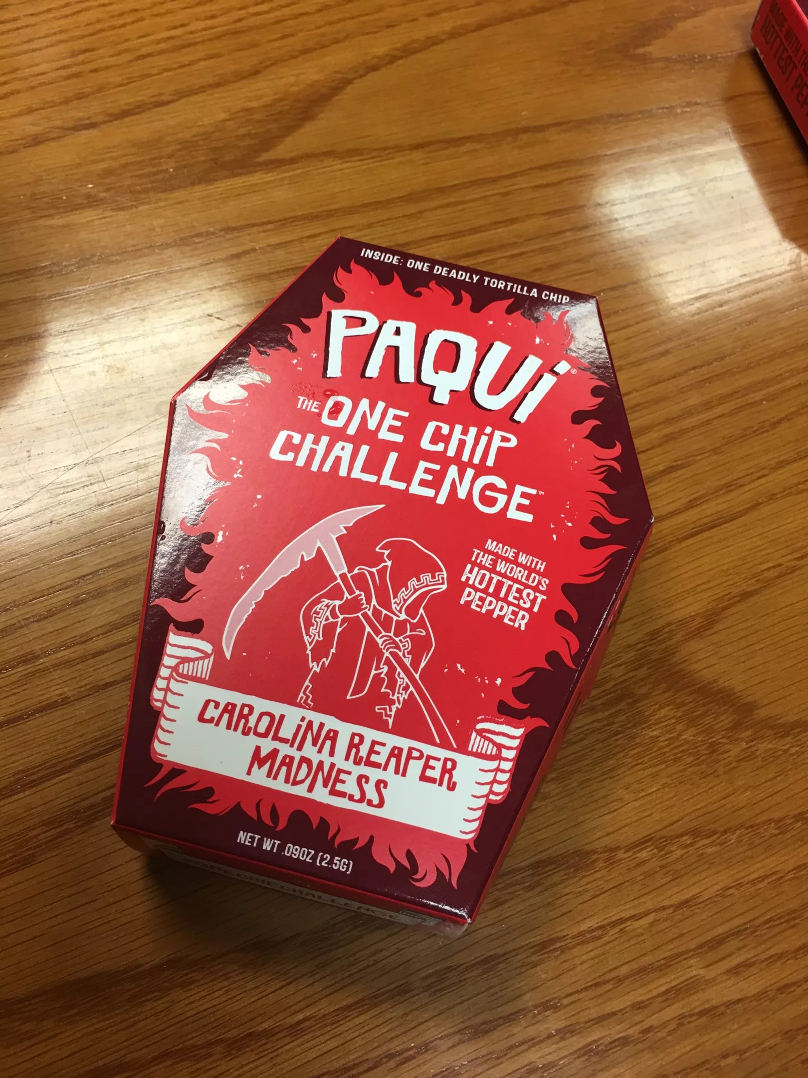 It wasn’t all that simple once I started looking at the red, coffin-shaped box each individually wrapped chip rests in. Warnings were scribbled ominously about the “deadly tortilla chip.”