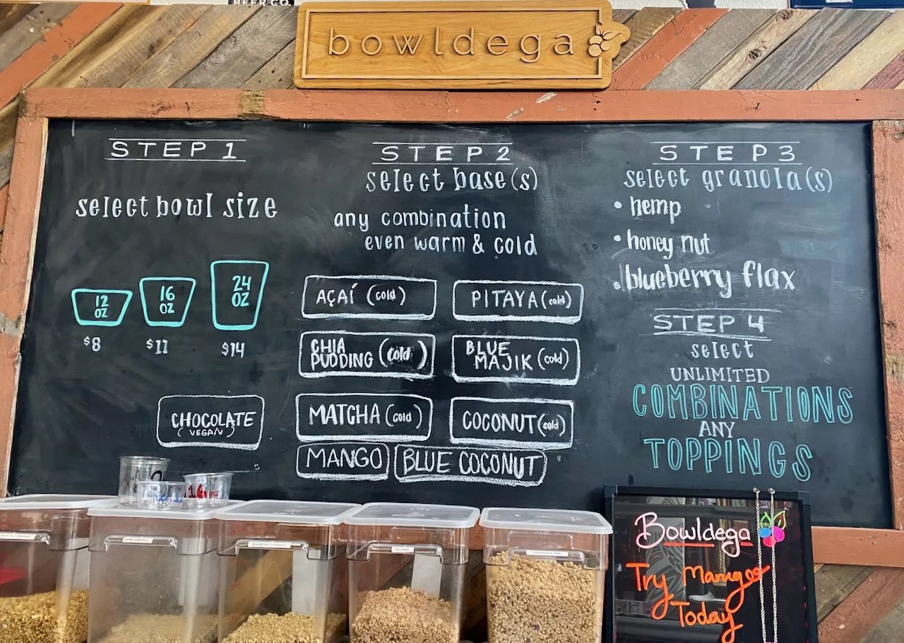 Bowldega operates inside of Bodega at the AMLI apartments in the Design District. They have a chalkboard behind the counter that details how to build your bowl, which is good for rookies. A medium is $11 and after selecting your base there are not less than a dozen toppings to choose from, including chocolate nibs, agave, dried coconut, slivered almonds and granola.