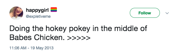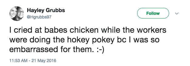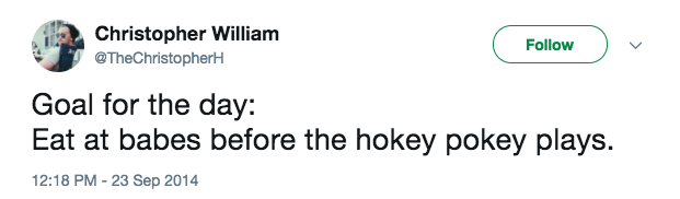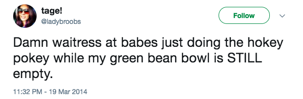 It’s unclear why Babe’s requires its servers to halfheartedly do “The Hokey Pokey” at regular intervals throughout the day. Calls to the restaurant and corporate office led only to several games of phone tag and unreturned messages. But if you search for “Babe’s Hokey Pokey” on Twitter, you learn that you’re not alone in your distaste for the oh-so-awkward dance.