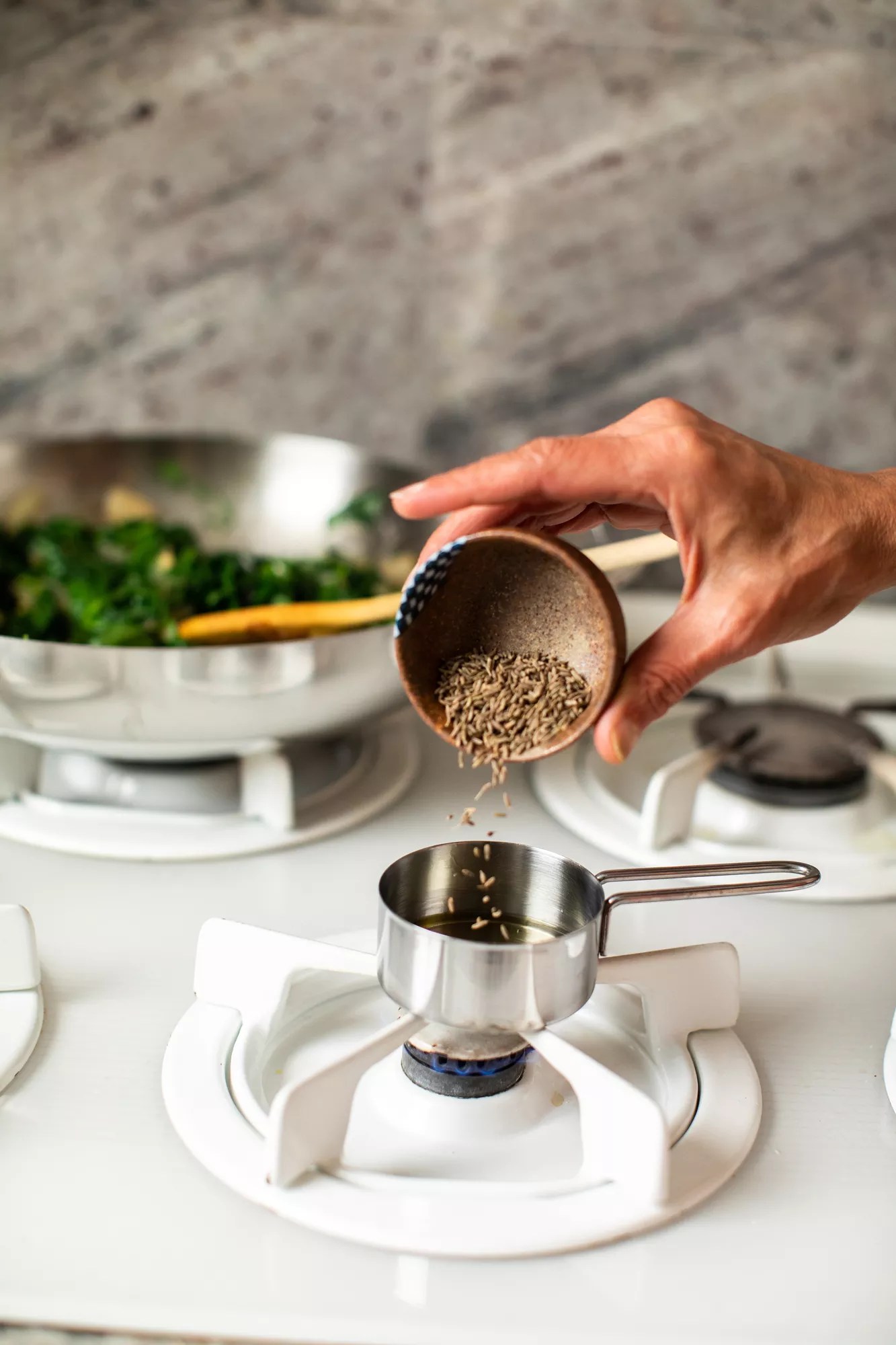 Priya Krishna cooks a version of saag paneer made with feta cheese, a recipe from Indian-ish.