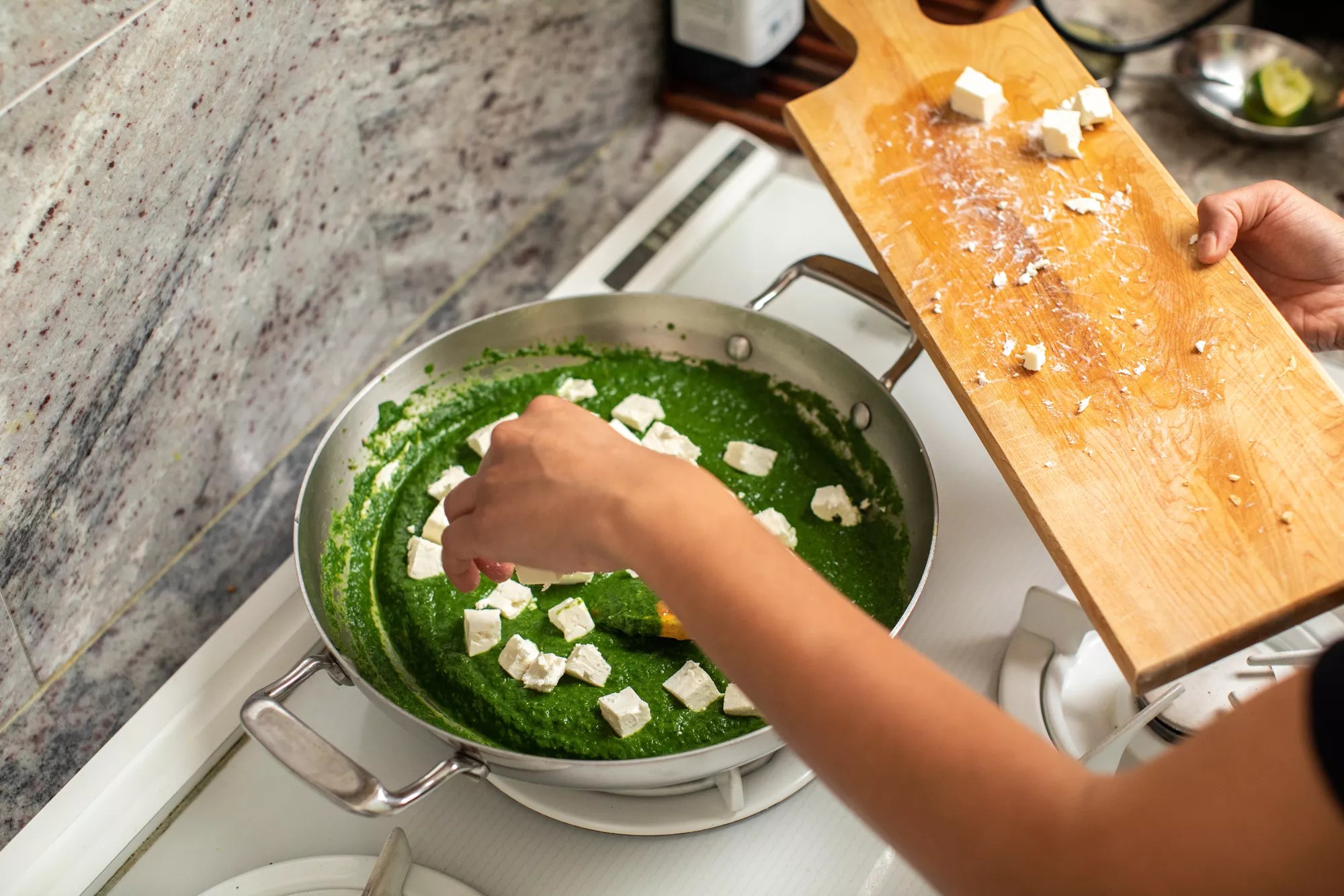 Krishna’s saag feta uses fresh spinach and feta cheese in place of paneer.