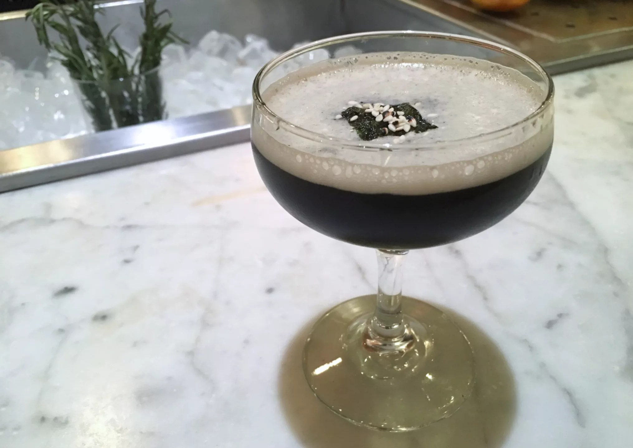 Stofko works squid ink into one of his new cocktails, the Seppuku Reale, by balancing out its brininess with bitter elements like Gran Classico and Amaro Montenegro, then brightening the flavor with a touch of lemon. Not to let the saltiness be downplayed, he adds a touch of Furikake Cordial (a cordial paying homage to the slightly salty Japanese condiment) and even tops the cocktail with a piece of seaweed and a sprinkle of furikake.