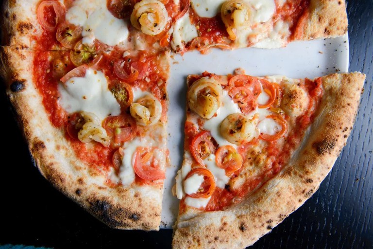 Pizza with San Marzano tomato, fior di latte, prawns marinated with garlic, cherry tomato, chiles and oregano at 400 Gradi.