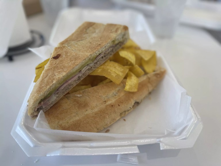 Cubano sandwiches are made with roasted pork, ham, swiss cheese, pickle and spicy mustard and are served with fried plantain chips and a signature mojo sauce.