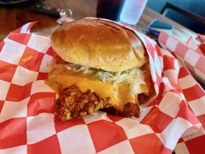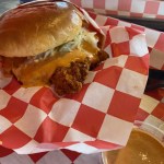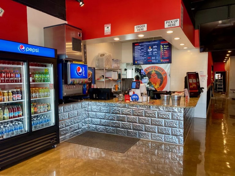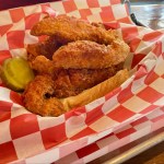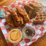 Hangry Joe’s is a franchise from Virginia with a location in south Dallas in the Redbird area off Camp Wisdom Road. The menu is pretty straightforward. They serve on-the-bone chicken, sandwiches and tenders. Heat levels start at zero, meaning no spice, with five more increasingly hotter levels. The final, angry hot, requires customers to sign a waiver. The sando is served on a brioche bun with a healthy does of their housemade hangry sauce, an reddish-orange mayo-based dressing with a tang. A mound of vinegar slaw adds a bit of crunch along with a few thick slices of pickles. The chicken filet here is fairly flat, rather than plump chicken strips piled onto a bun, which is often the case. The brioche bun here is substantial; it holds this hot mess together nicely. We got the mild spice (level three out of six) and it was just that: mild. Discernable, but no sweat or lingering heat on lips. The chicken strips come four to an order and are served on a slice of white bread along with a few pickles. Be sure to try the chicken and waffles, which, honestly, we’ve had so many dried-out chicken strips and bland waffles, we’re often left with more questions than answers in terms of the appeal. Well, now we know. These housemade funnel-cake-like waffles have a light airy texture that is slightly crispier than your typical waffle. An order is served with four waffle triangles and four chicken strips along with a packet of syrup, honey butter and their house sauce.