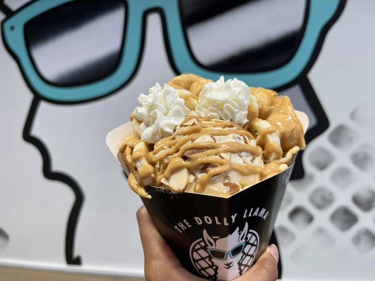 The Dolly Llama’s signature bubble waffles are a lighter waffle based on a popular Hong Kong street food. These are served warm with a scoop of ice cream and other toppings – ranging from creamy to crunchy to soft (photo at top).
