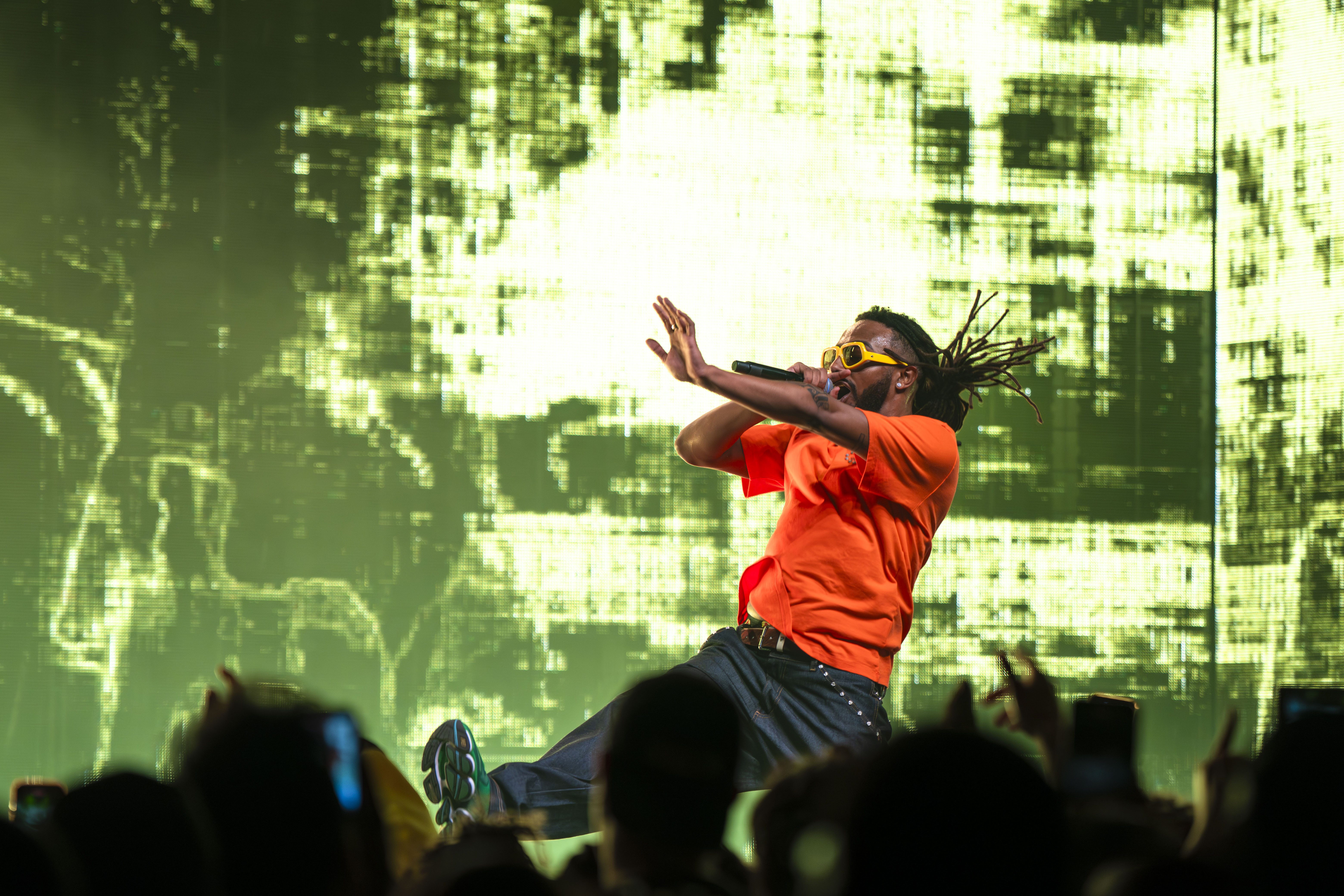 “Caroline” was the grand finale. Taking a camera from one of his camera guys, the gifted director put back on the yellow shades he was wearing at the start of the show. He would point it at himself and the crowd, doing an almost acapella version of “Caroline” with minimal beat. The crowd projected on the screens, a cool shot with the camera phones recording him. He modified the lyrics too, telling people, as the “Killa” line came up, not to say it if they’re not Black.