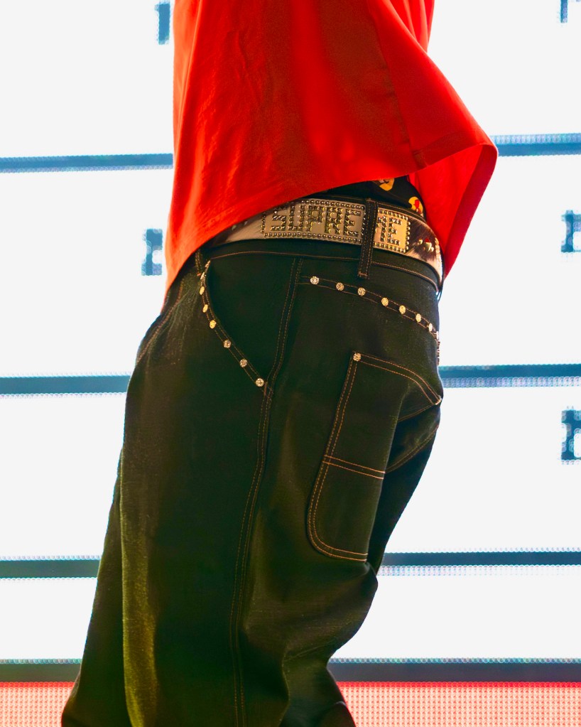 He shared that his first Buc-ee’s trip was this week, trying out the brisket sandwich. He loved it so much that he’s willing to kick his healthy tour diet for it. He complimented two groups of people who were “really fucking fly”: two girls wearing robes from the “Vacay” video and four others wearing banana head costumes. He led the crowd to sing Happy Birthday to one of his fans. He brought someone up to sign his tour pants and write personal words on the theme, a tradition where they design a patch for every city and attach it to the pants at every show.
