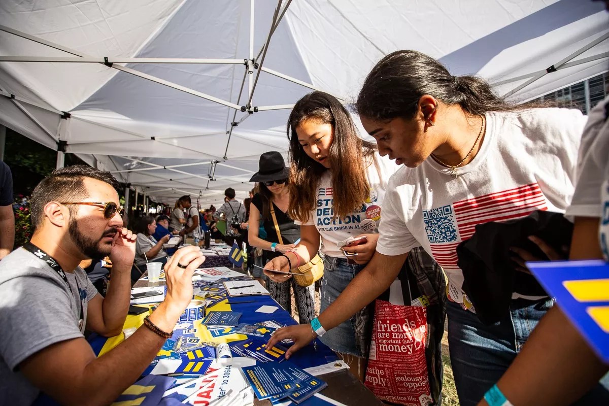 Rain started pouring hard around 6:20 p.m., forcing some to head for cover, while others made their exit. The rain lasted for 20 minutes, but it came back in small waves until the end of the event. People would huddle under tents for shelter, giving an open opportunity for clipboard-wielding volunteers to see where the concertgoers were registered, why they were not registered and how easily all this could be fixed with a quick trip to the registration tent.