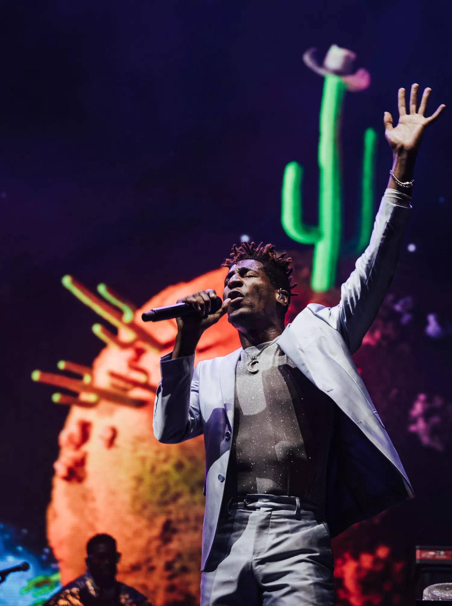 At 6:30, band Greta Van Fleet rocked out, recalling a new coming of Led Zeppelin. But no doubt, Sunday’s highlight was at the T-mobile stage with Jon Batiste, who put on a spiritual and face-melting otherworldly performance, like the male counterpart of Badu, with visuals of space and planets covered in colorful cacti.