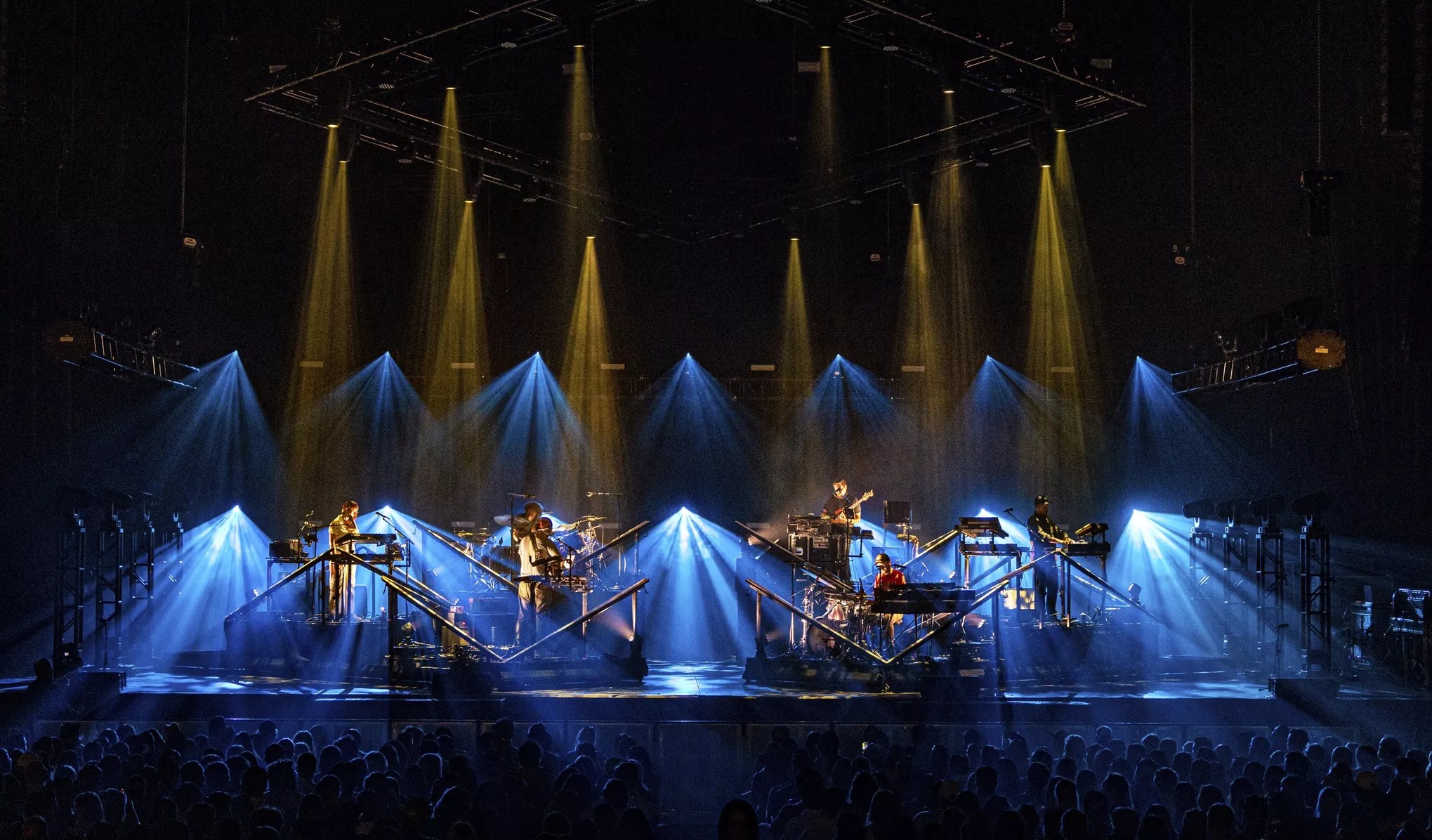 Vernon and his collaborators were alone together on the sparely dressed stage, each standing on their own platforms, ringed by lights that pulsed and glowed and dazzled in tandem with the lighting rigs suspended on either side of and above them.