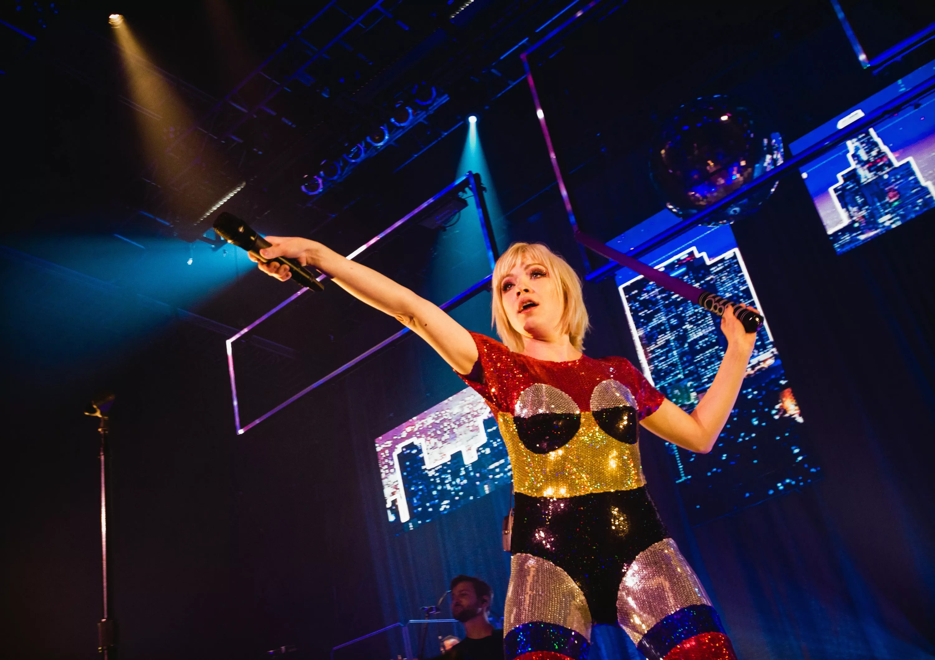 Jepsen’s set was stacked high with songs savoring and lamenting love from a variety of angles, reflecting and refracting sorrow and joy like the light bouncing off the disco ball mounted in the rafters above her. Backed by a six-piece band – four musicians and two backup vocalists – the ebullient Jepsen was greeted with a roar as she appeared and launched into “No Drug Like Me,” from Dedicated, her most recent studio album and the title of her tour, which stretches into October.