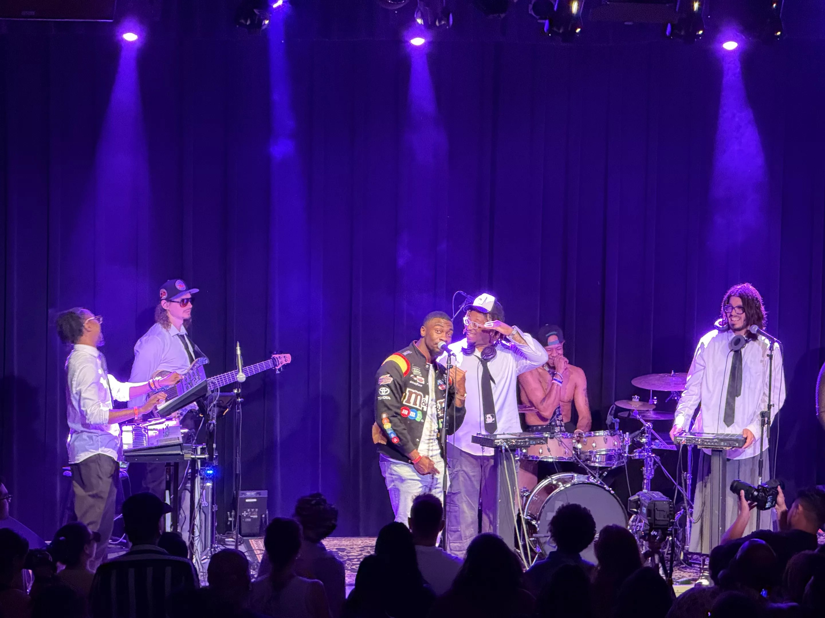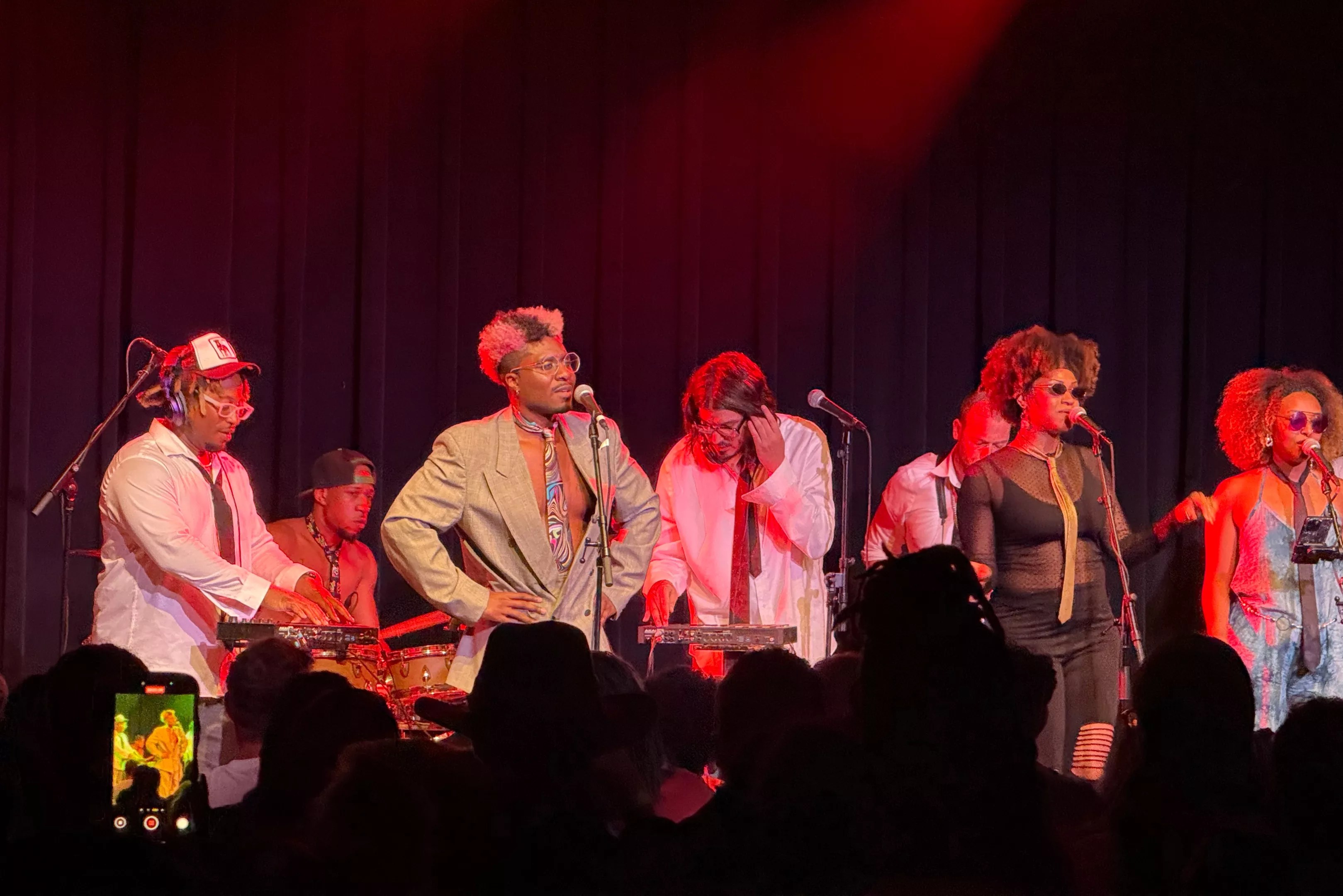 There were 10 people performing as part of the band at the Kessler show, combining the allure of a big band jazz set with the in-your-face thrill of alternative hip-hop. McCloud led with a commanding, endearing stage presence backed up by the skillful delivery of his hundred-word-a-minute raps and his collaborators’ instrumentals. Tye Harris made a surprise appearance, engaging in call-and-response with the audience and showcasing his freestyle skills. Before he left, Harris helped kick off the show’s final stretch, launching into the hook for “The Artshow” and embracing McCloud.