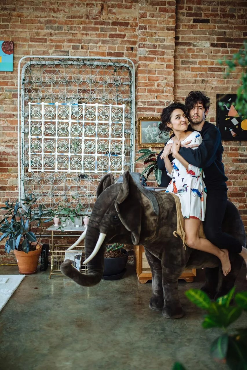 The couple also are learning to host. Their Christmas party was an unforgettable gathering in which they took turns giving dramatic readings of a children’s story and toasting the event by, well, handing out toast. They enlisted their favorite musicians, like Metcalf, harpist Jess Garland and singer Sudie, to serenade their close circle of artist friends with carols. Their Christmas tree is still up. But “at least it’s not lit,” as Rios says.
