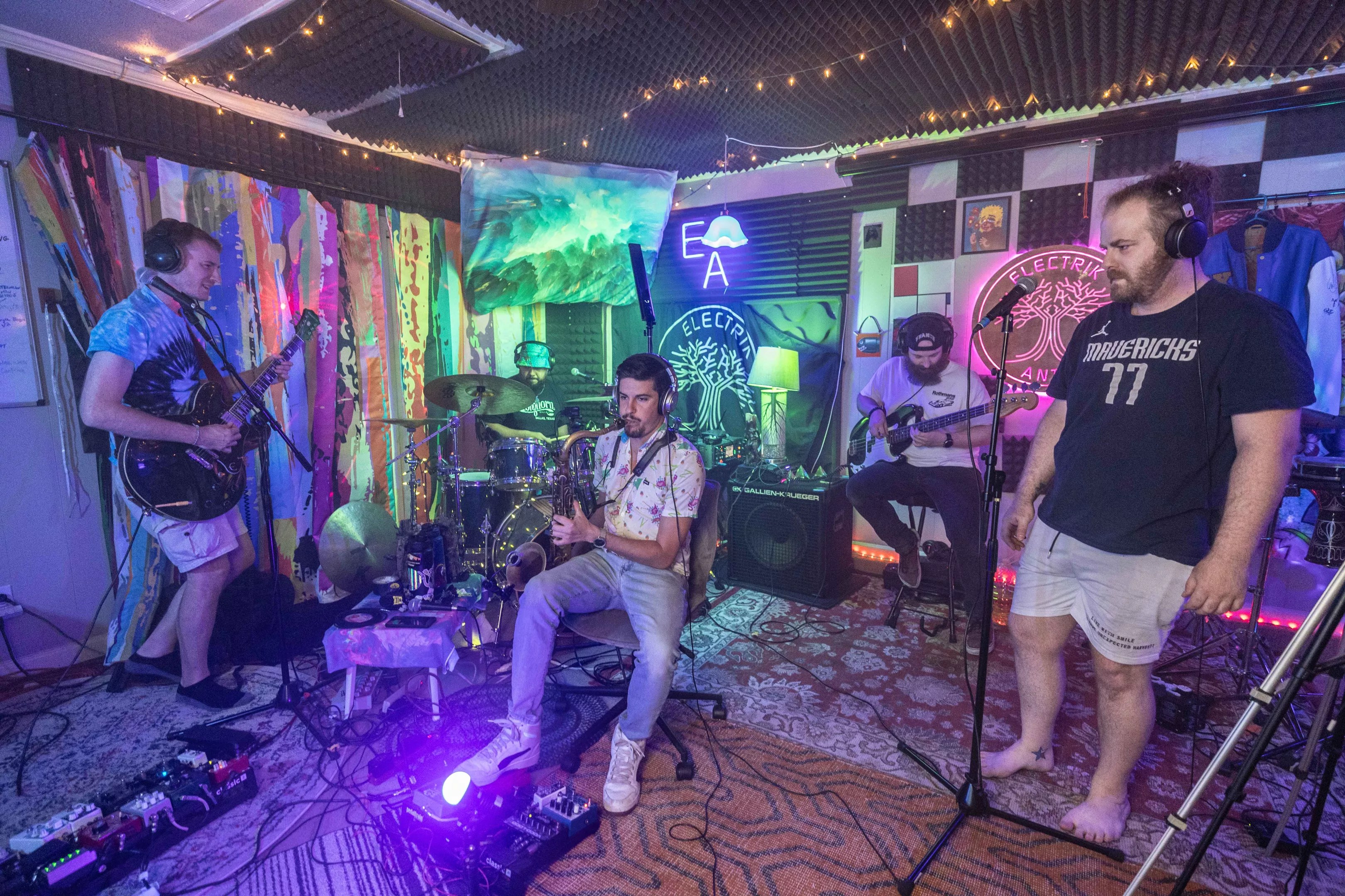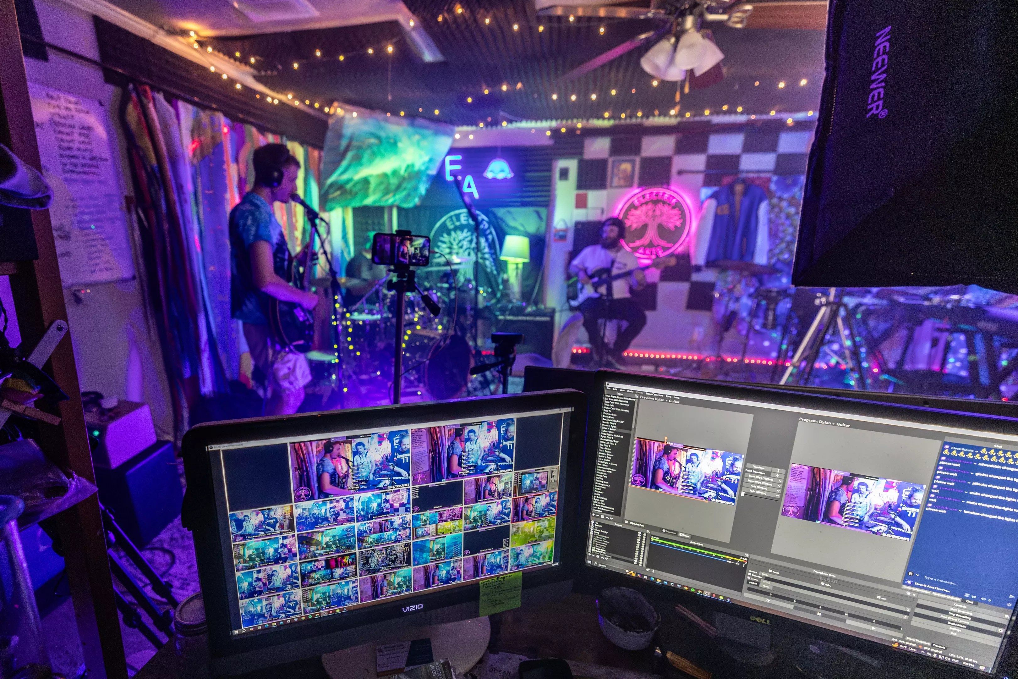 It’s almost showtime for the Electrik Ants. They’re checking sound levels, getting tuned up, maybe going doing a run-through on the ending of that one song. The players turn their pre-show jitters into the perfect headspace to jam. This is a typical pre-gig prep, with one difference: We aren’t at your favorite club, but in “The Lab.” This show is a livestream.