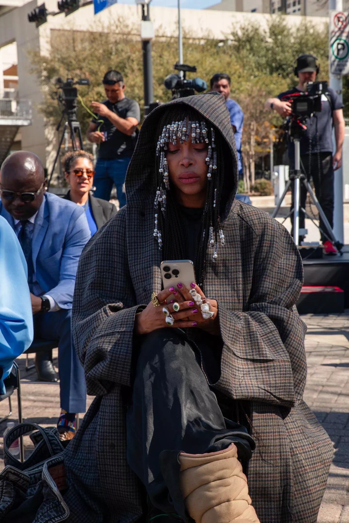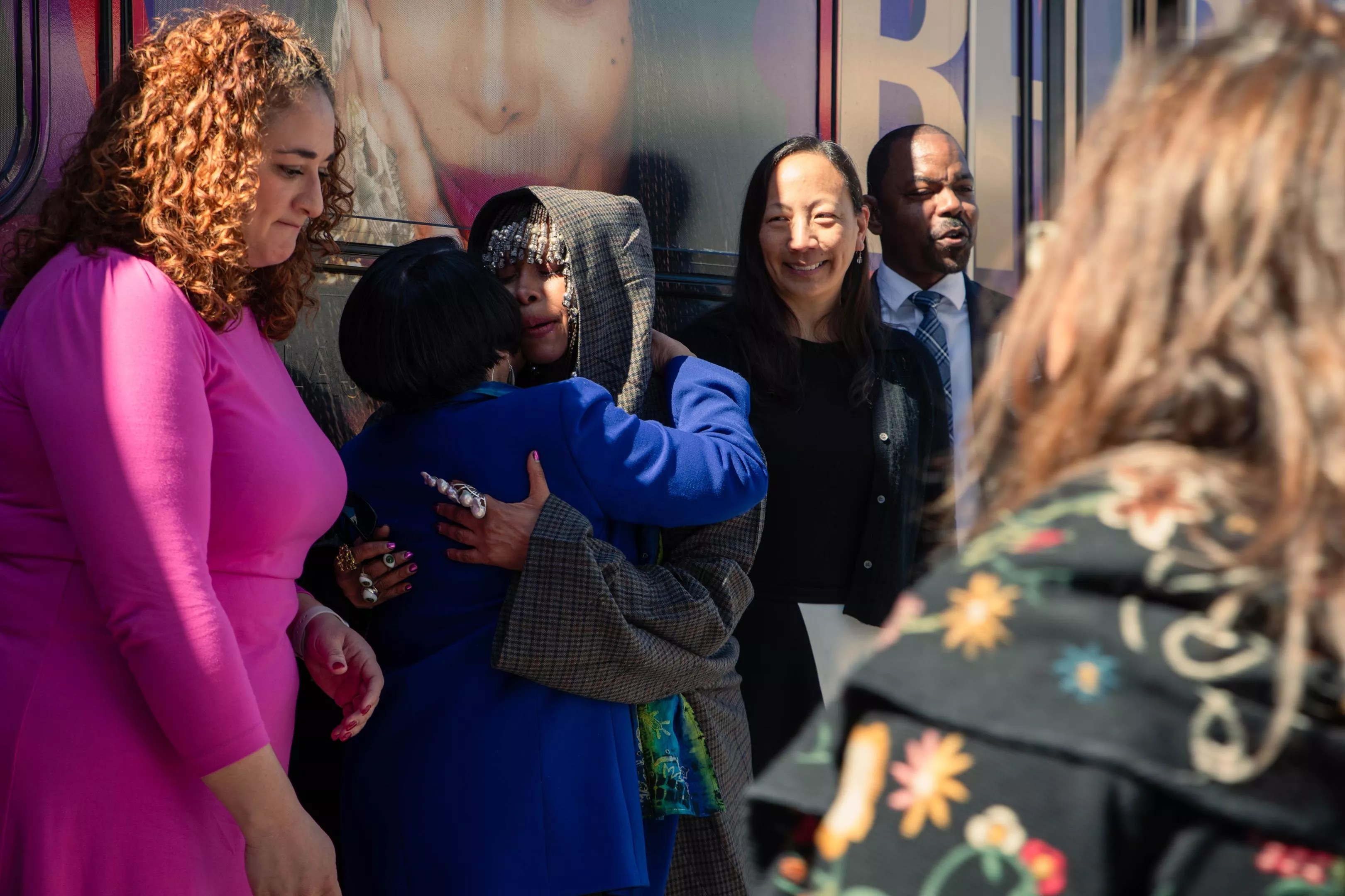 Badu took to the stand in an oversized coat, her hair adorned with a fringe of metal braid beads. Dozens of high school students stood on the side watching the school’s famous alumna as she spoke of her “fond memories” on the bus, though she longed then to never have to ride the bus and instead have her face on its side.