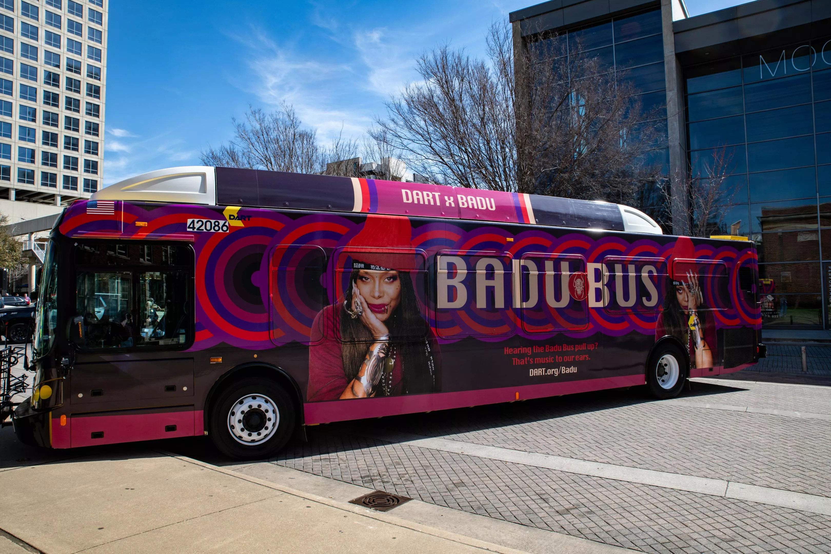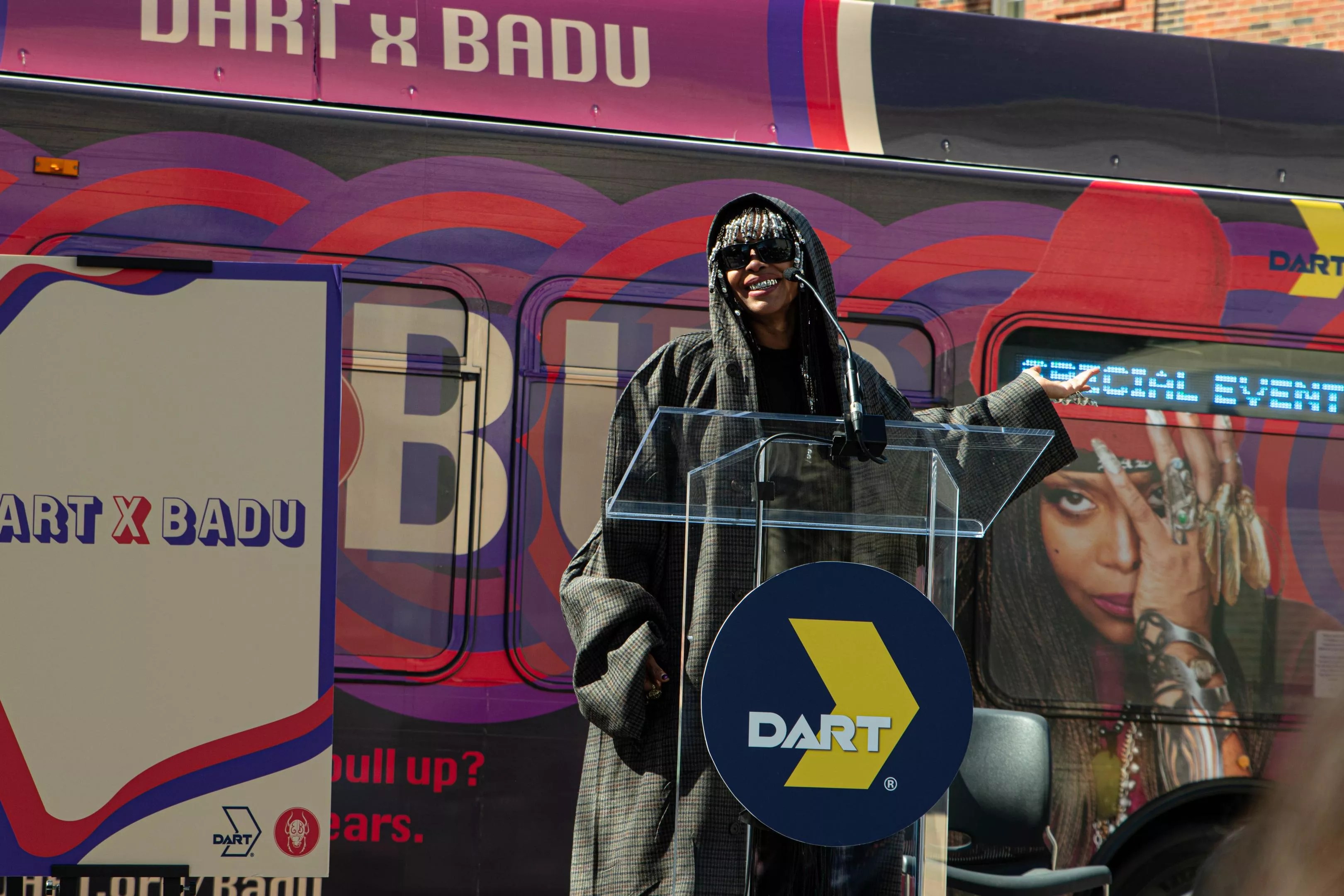 The occasion was as big as the singer’s legend. DART will be honoring the city’s most illustrious (best of luck trying to fight us on this) musician with three buses and two trains wrapped with Badu’s photo. These “Badu Buses” will run until the end of the year.