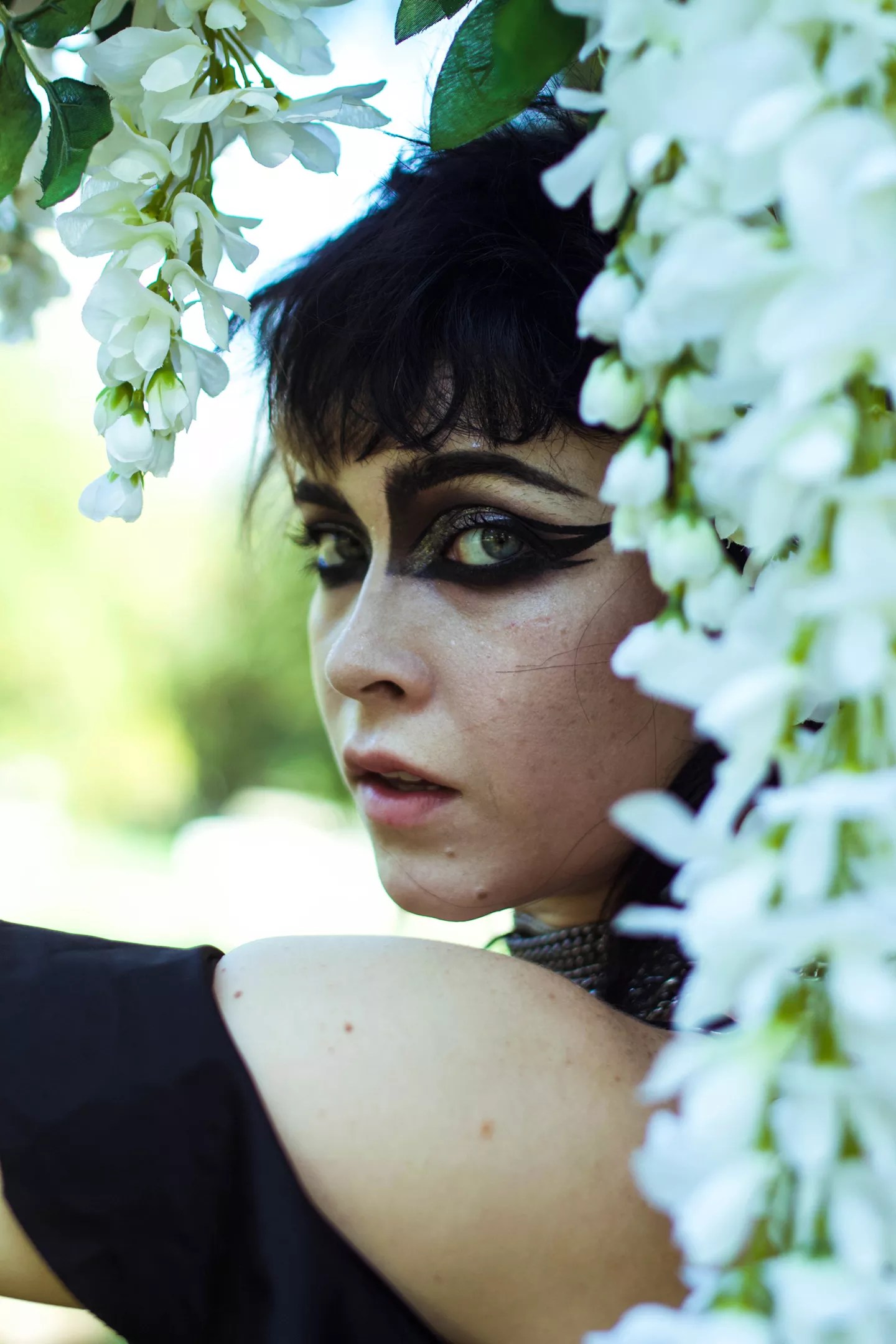 Venturing out into the band’s backyard, between the French windows looking out on the porch and the peeling shed ensconced in thick ivy, one finds artists displaying their works and conversing with the Goths floating from house to yard and yard to house. It’s hot. The dressmaker, sweating in her corset, is sitting on the ground stitching a collar onto a top she made out of some bike shorts to wear instead. One of the vendors, artist Jet Smith, is selling paintings of Marilyn Manson, baby pigs in a jar and other taxidermy decorated so fancifully that the effect becomes comedic, like animal skulls trimmed with ribbon. They’re the kind of works of art that fit right into Rosegarden’s world.