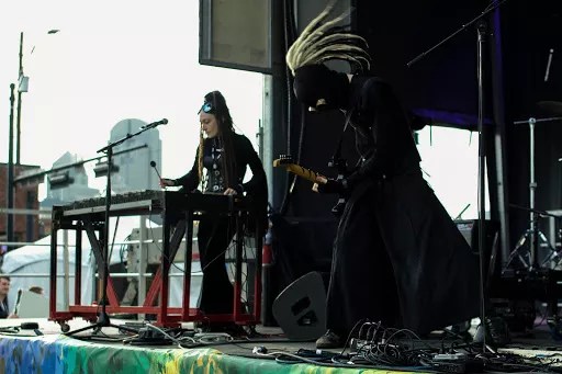 “(Vibraphone player) EvE meditates on the structural solidity of her self-made vibraphone, only breaking from its trance to gaze with white eyes through the audience,” says ManifestiV’s lead singer and guitarist Paragraph. “Meanwhile, I hover, rotate, even flail – barely keeping physical control of my guitar. My animist nature, and more so the music, brings the instruments to life. Our polarizing all black and white head-to-toe outfits also reflect the far extremes our sound spans within a set.”