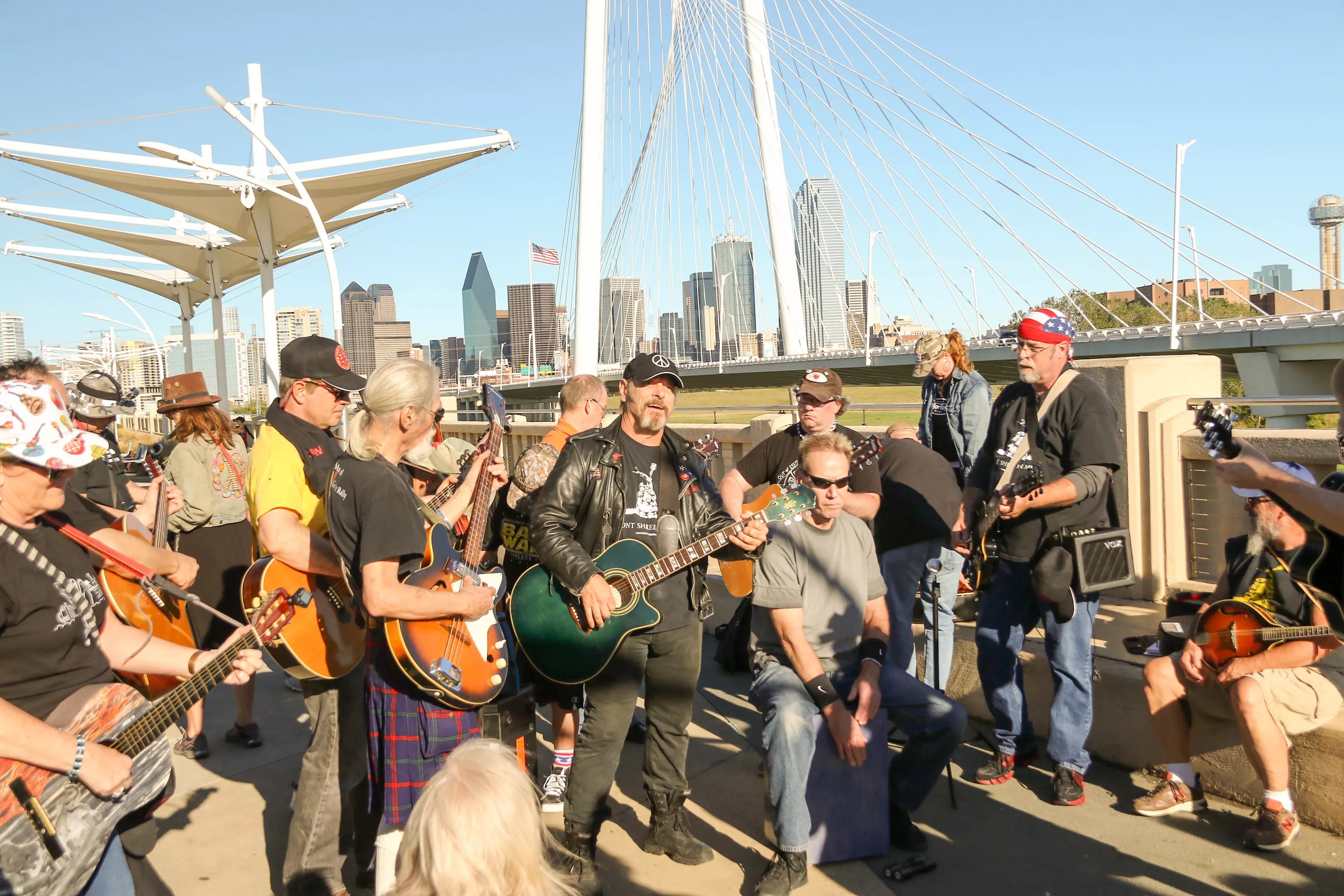 Barry “Kooda” leads a jam session on the Continental Avenue pedestrian bridge during the fourth annual Open Carry Guitar Rally.
