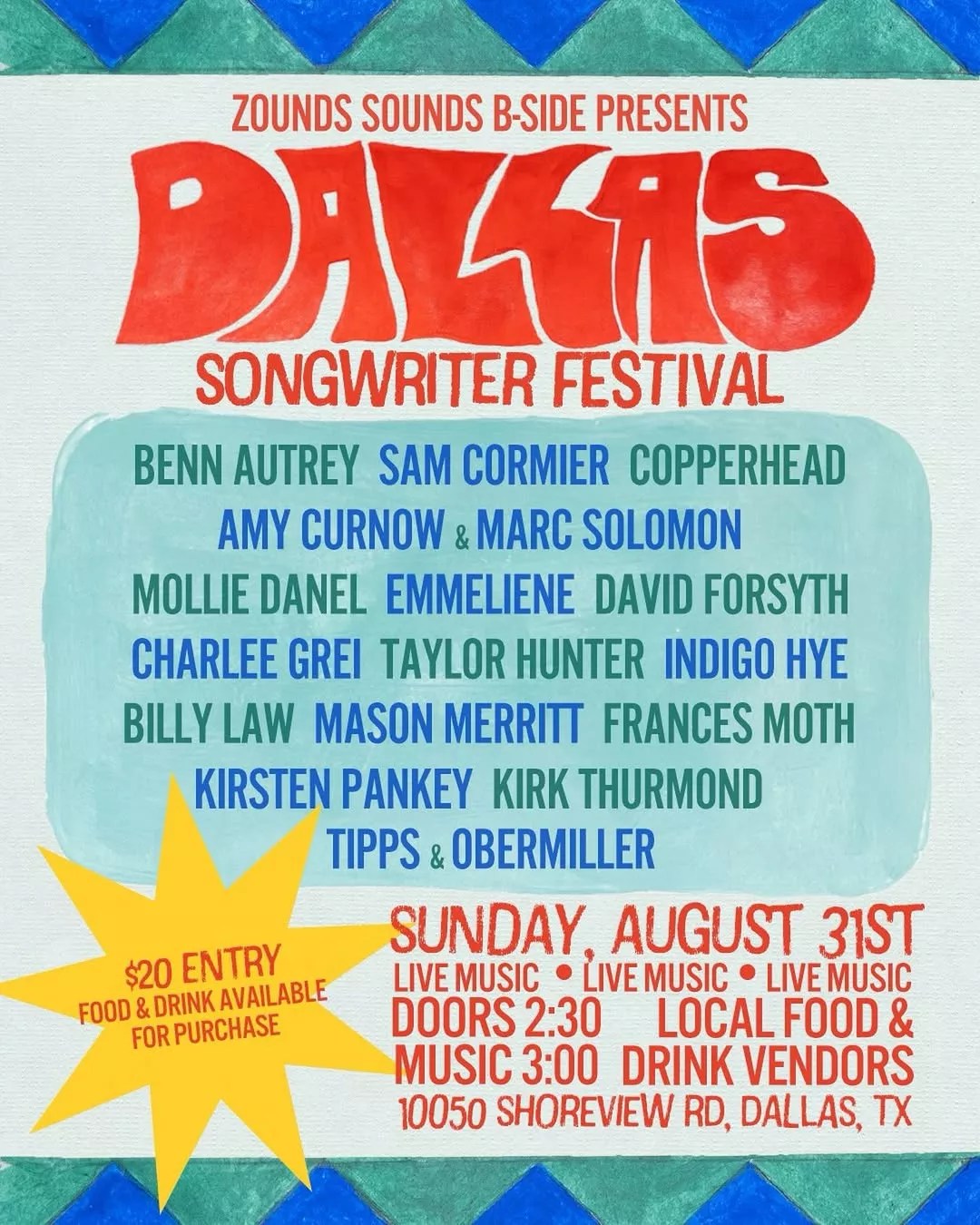 Dallas Songwriter Festival will be held on Sunday, Aug. 31, at 2:30 p.m. at Zounds Sounds B-Side, 10050 Shoreview Road. Tickets are $20.