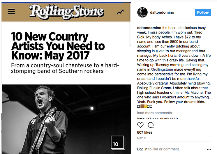 On May 9, Rolling Stone listed Domino as one of its country acts to watch. In response, Domino posted an honest and heartfelt Instagram post. Even though Rolling Stone thought enough of him to include him on the list, he was tired, he missed home and he only had $72 in his name.