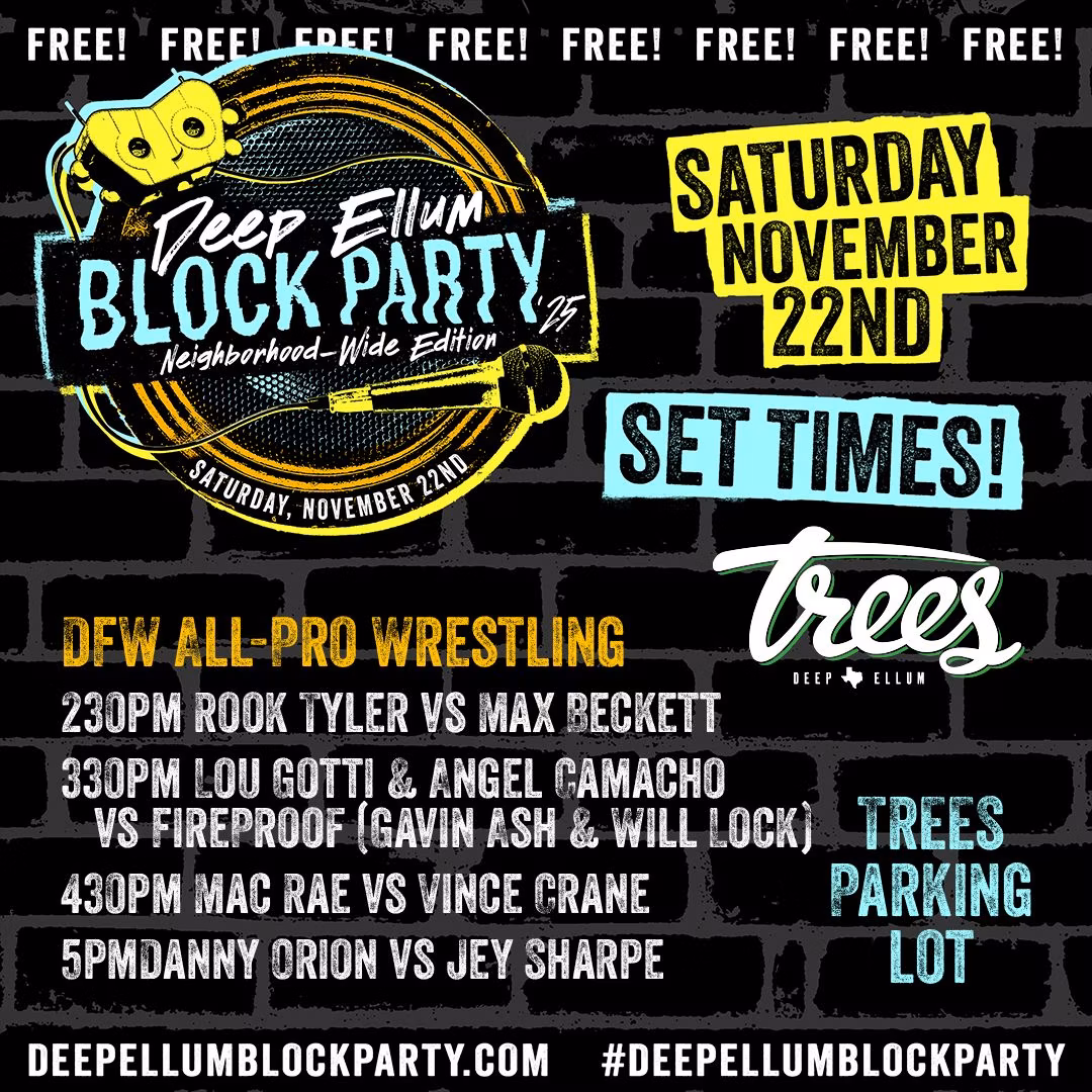 With over 100 artists set to hit 20-plus venues, it truly is all the free music you can handle. The general buzz surrounding the Deep Ellum Block Party is the live pro wrestling, headliners Mothership and Joshua Ray Walker and an A.Dd+ reunion. Whether you’re a seasoned Deep Ellum Block Party goer or a newcomer eager to dive into local music, we got you covered with a schedule you can follow.