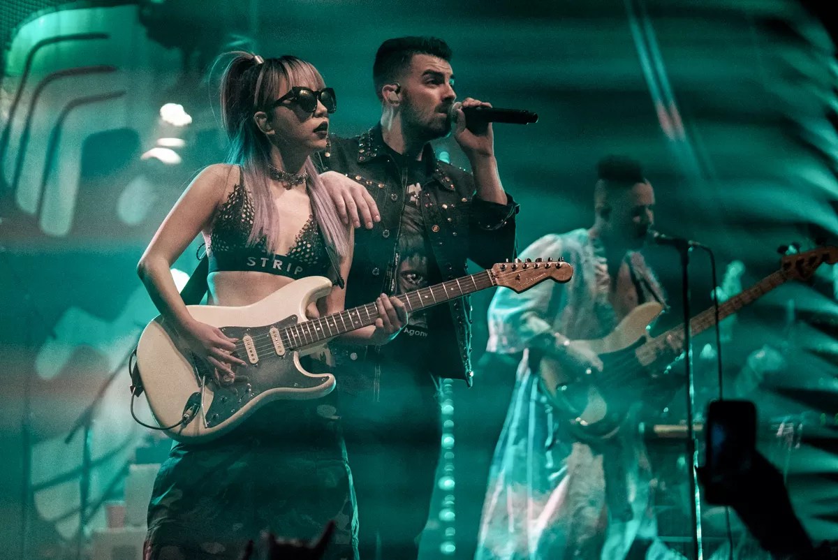 Their first two singles, “Cake By The Ocean” and “Toothbrush,” both allude to sex. Then during their performance of the song “Blown” (about you-know-what), a grocery cart of bras and panties were paraded around the stage, while one bra hung from the bass player’s mic stand. Sex! Joe Jonas has had sex! Congratulations to him.