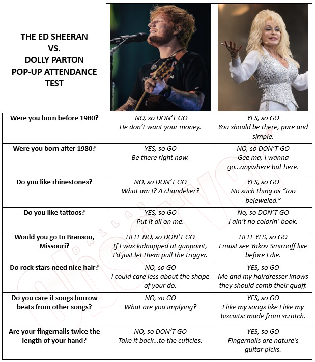Let’s just say that you’re a huge fan of Sheeran and Parton and you can afford only enough gas or one ride or bus pass to one of those events. It could happen. Have you seen what rent costs these days?
