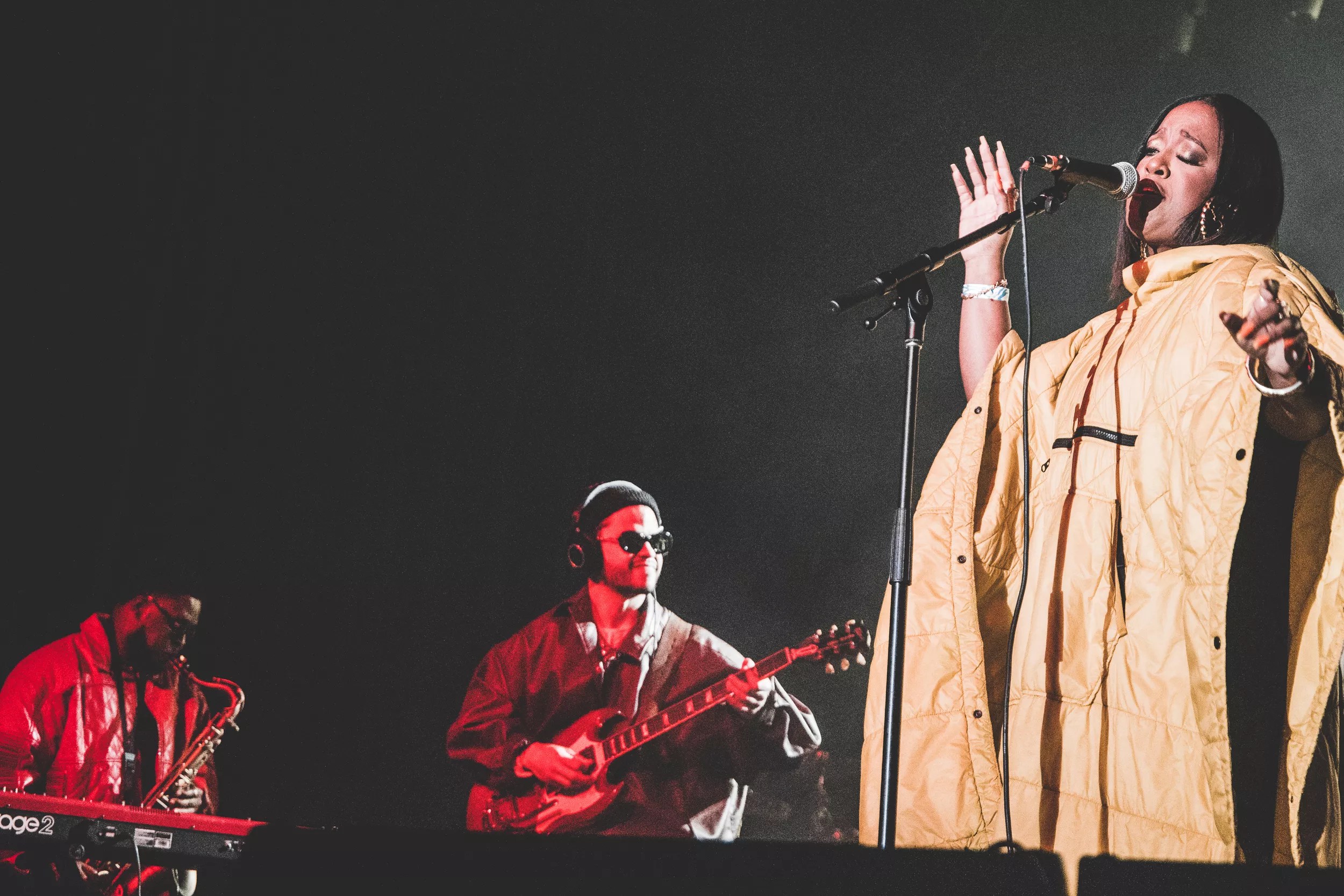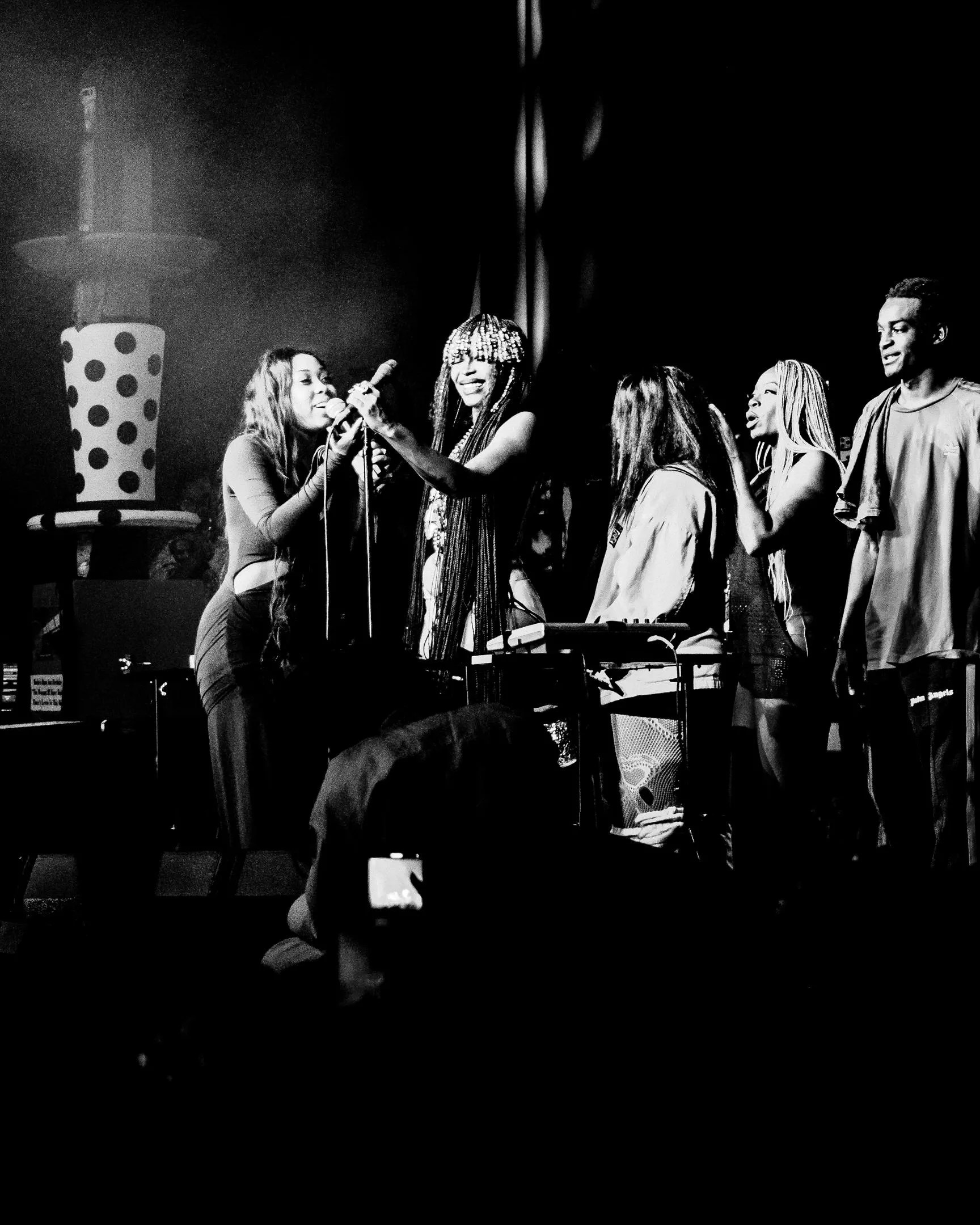 Badu changed some of the lyrics of “Me” to reflect her current life. Her three children stood with her inside a light-and-smoke-filled pyramid before bringing out a massively tall cake with an effigy of Badu at the top. Her middle child, daughter Puma, sang “Happy Birthday” as the crowd sang along. Soon after, balloons and confetti filled the whole space.