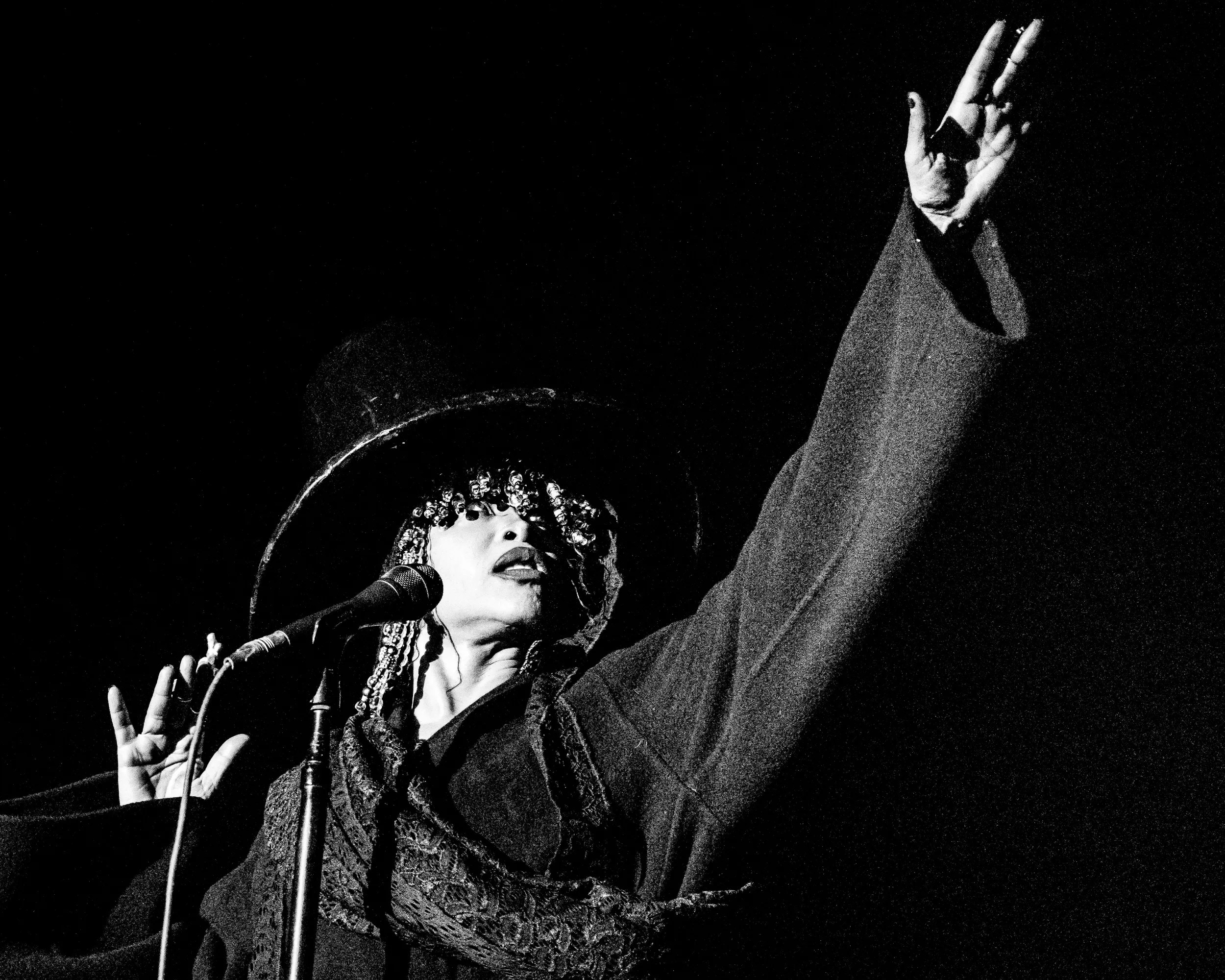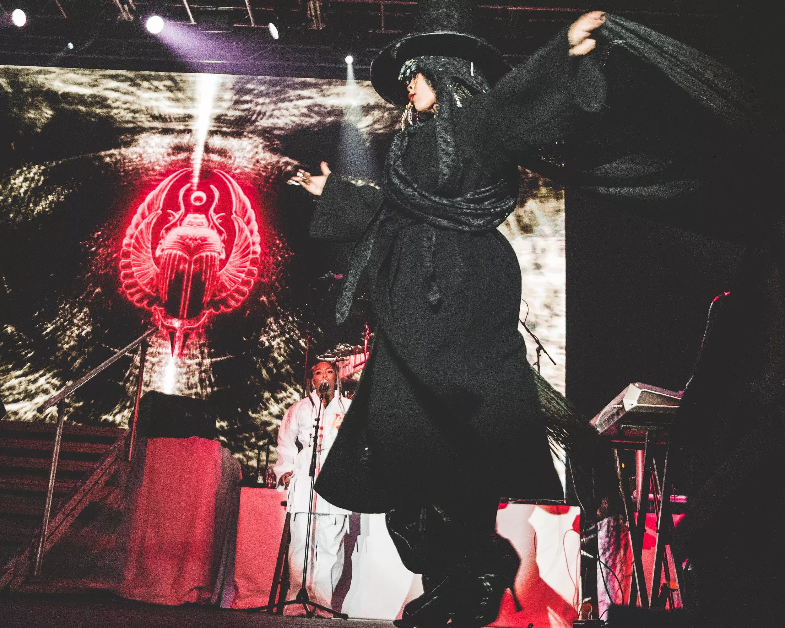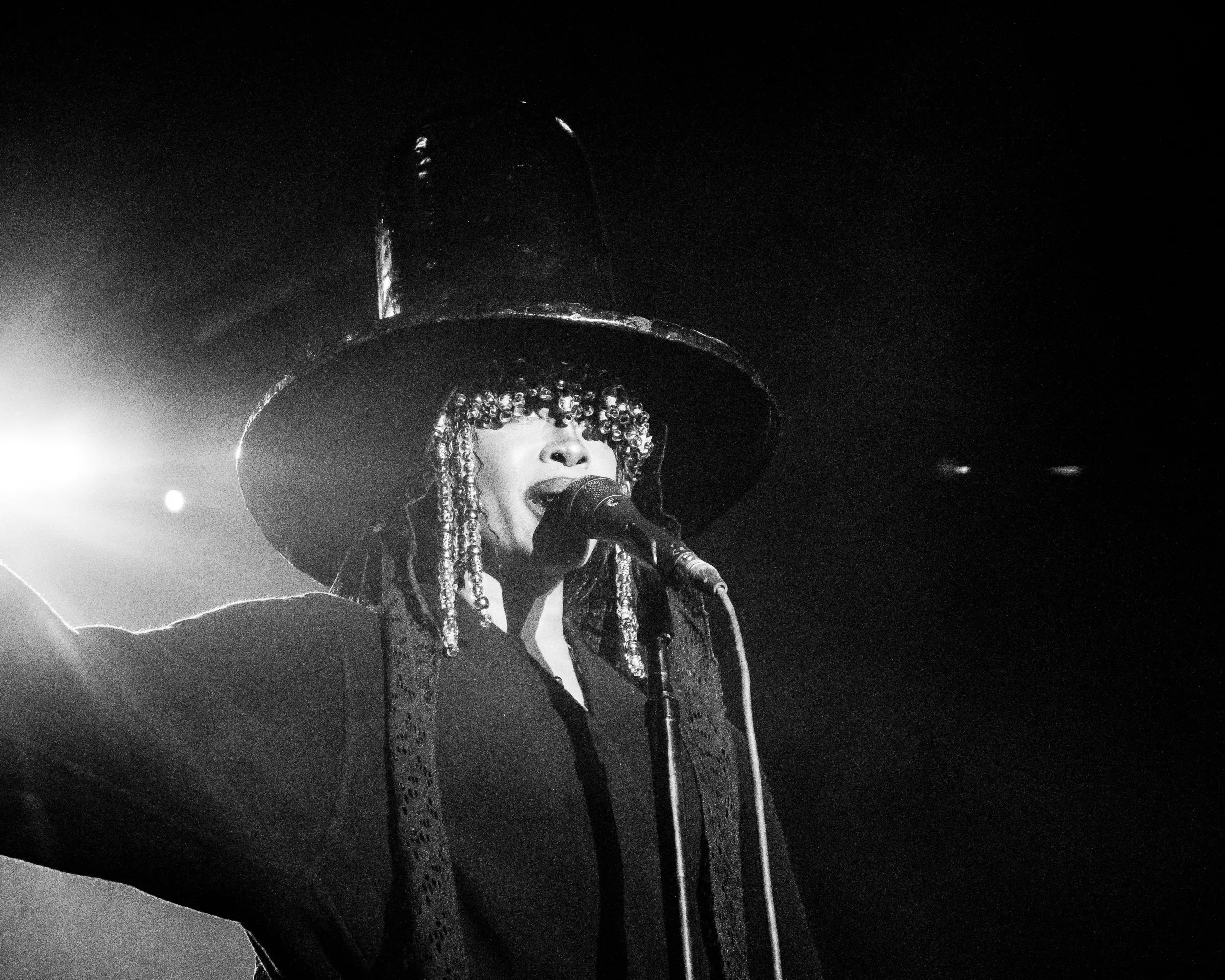 As thunder clashed in the background, Badu came out wearing a tall black top hat and a black gi. She walked to the mic as a stomping noise clapped for each of her steps and announced herself.