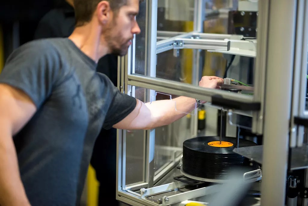 Dustin Blocker reaches into one of two record presses, aligning a mechanical arm to move records to another plate.