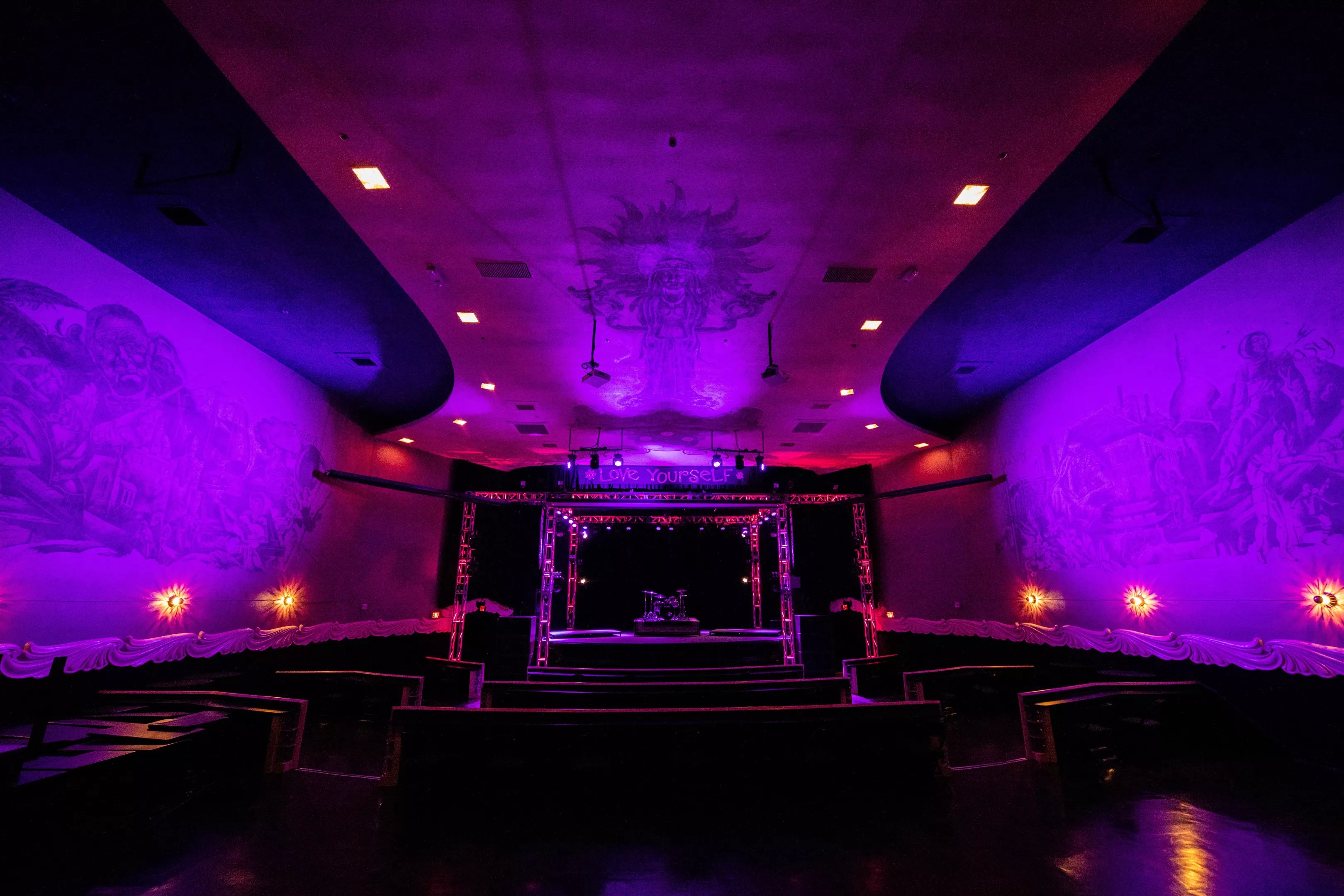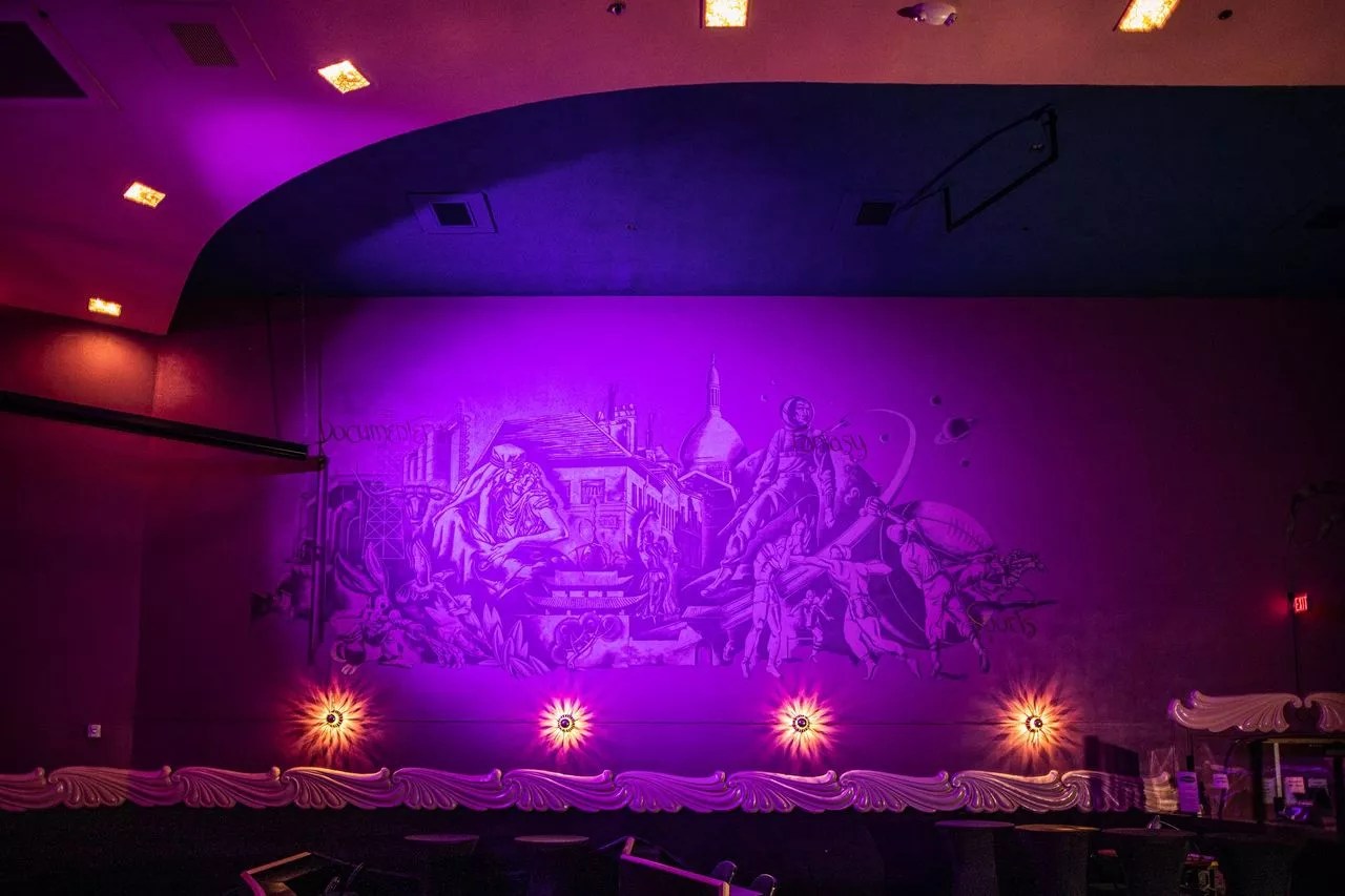 Among the most striking and recognizable details in The Granada are the three large murals original to the building on both walls and ceiling of the main space. The murals reflect the history of the time, from President Harry S. Truman to the Manhattan Project and the atomic bomb. The paint surrounding the murals has changed over the years, and its restoration is no easy task.