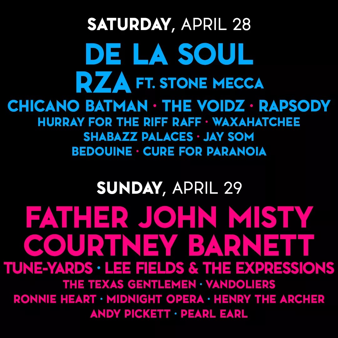 This morning they announced the daily schedule for the burgeoning festival’s second year. The first round of performers, on Saturday, April 28, will include De La Soul, RZA featuring Stone Mecca, Chicano Batman, The Voidz, Rapsody, Hurray for the Riff Raff, Waxahatchee, Shabazz Palaces, Jay Som, Bedouine, and Cure for Paranoia. Closing the festivities Sunday, April 29, will be Father John Misty, Courtney Barnett, tUnE-yArDs, Lee Fields & The Expressions, The Texas Gentlemen, Vandoliers, Ronnie Heart, Midnight Opera, Henry the Archer, Andy Pickett and Pearl Earl.