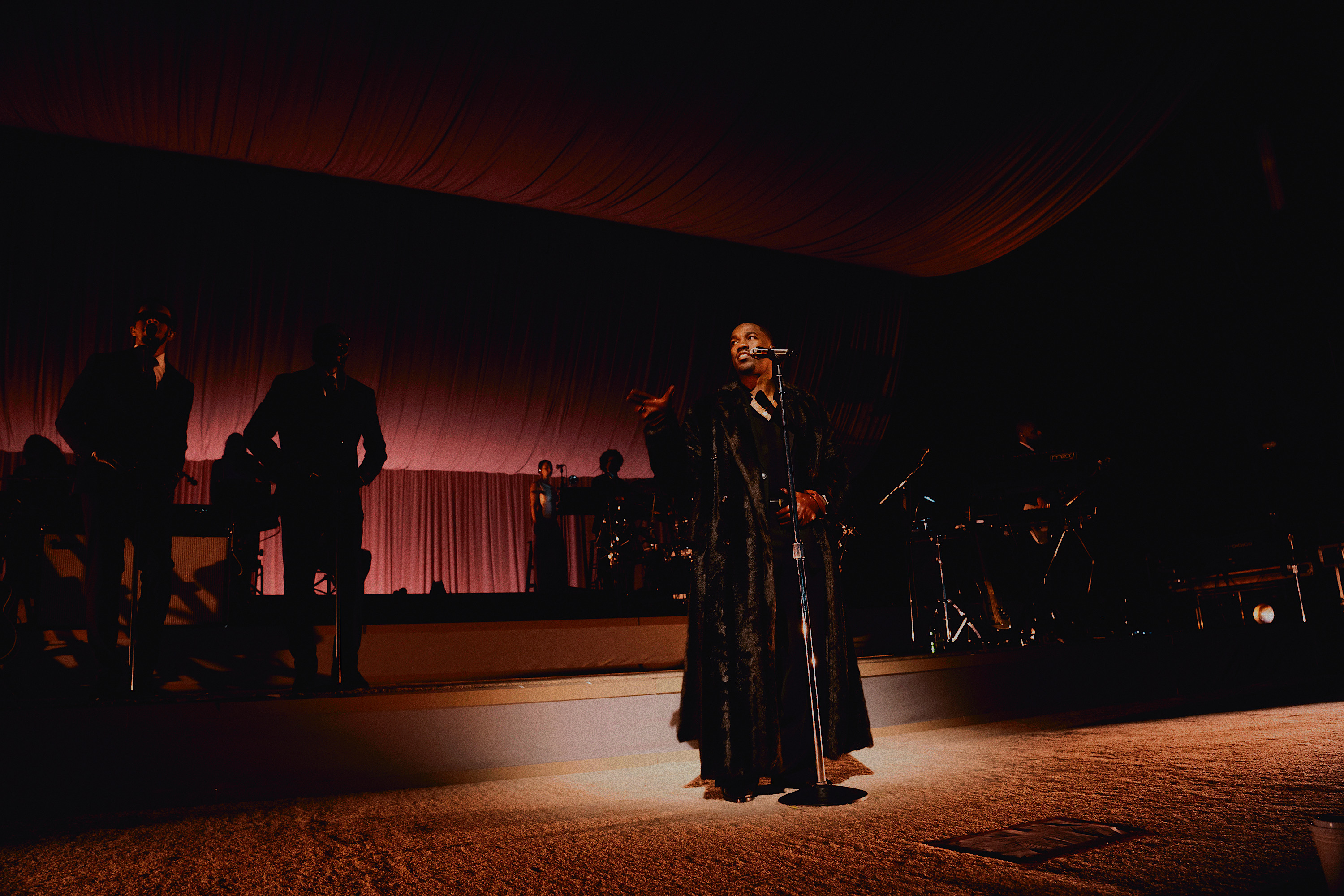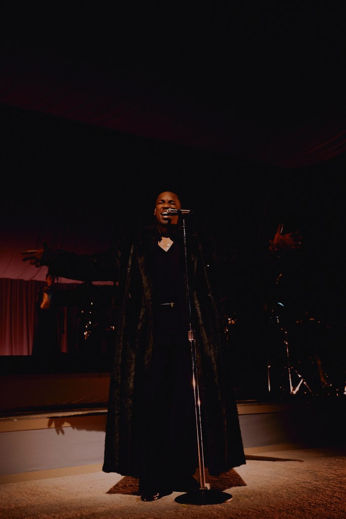 As the lights lowered, Giveon took the stage in a floor-length brown coat draped over a classic suit and leather gloves, making a nod to past legendary superstars who had prominently worn fur coats. The symbol of the fur is flashy, but the set design was simple and reminiscent of ‘60s and ‘70s music variety shows from Motown stars like The Temptations. The show mirrored those vintage vibes down to holding the classic condenser microphone with colorful lights illuminating a three-tiered curtain. The venue screen displayed the show in black and white, and the band wore uniform black and white suits, performing simple, synchronized steps throughout the show.
