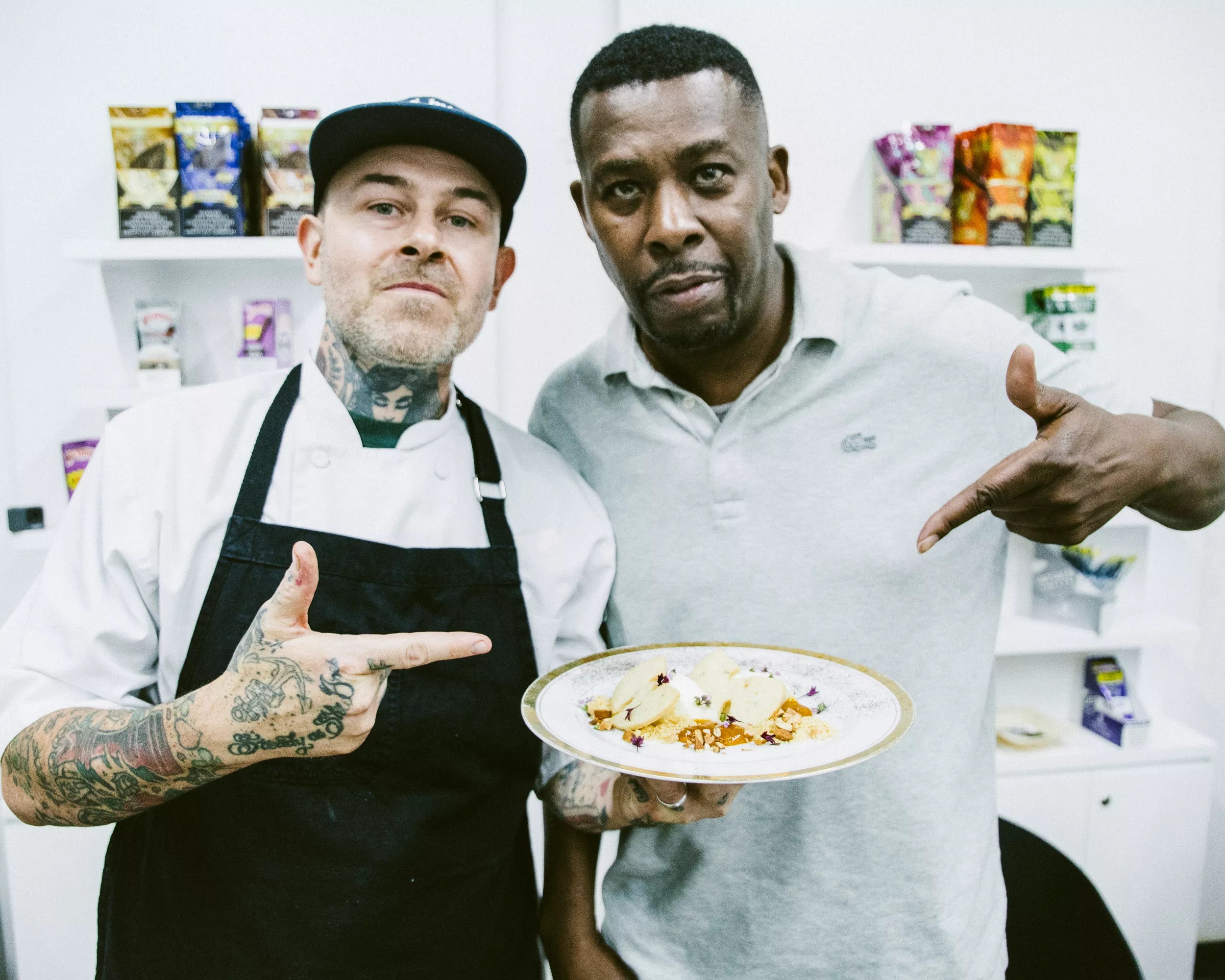 The VIP party moved next door after it became uncomfortably hot in the store. There, chef Justin Box was whipping up a four-course meal consisting of a beet and wild greens salad, risotto, a corn bisque with aquafaba ‘mallow fluff, and a dessert that paid homage to the man himself: Wu-Tang shortbread cookies he’d whipped up the night prior.
