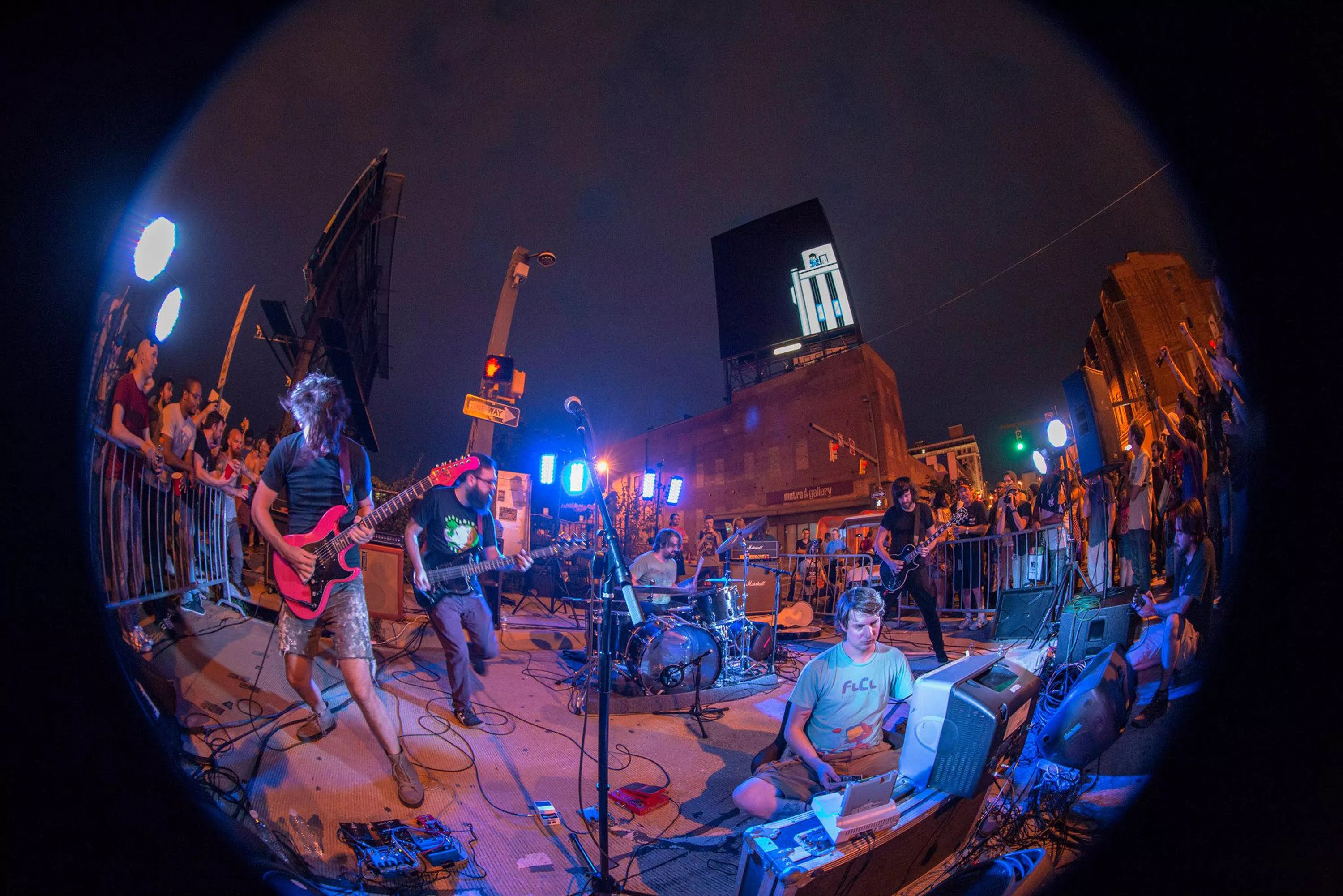 The video game rock group Bit Brigade performs a cover of the soundtrack for the video game Mega Man II at Artscape in Baltimore while Noah McCarthy (lower right) tries to defeat the 8-bit side-scroller before a live crowd.
