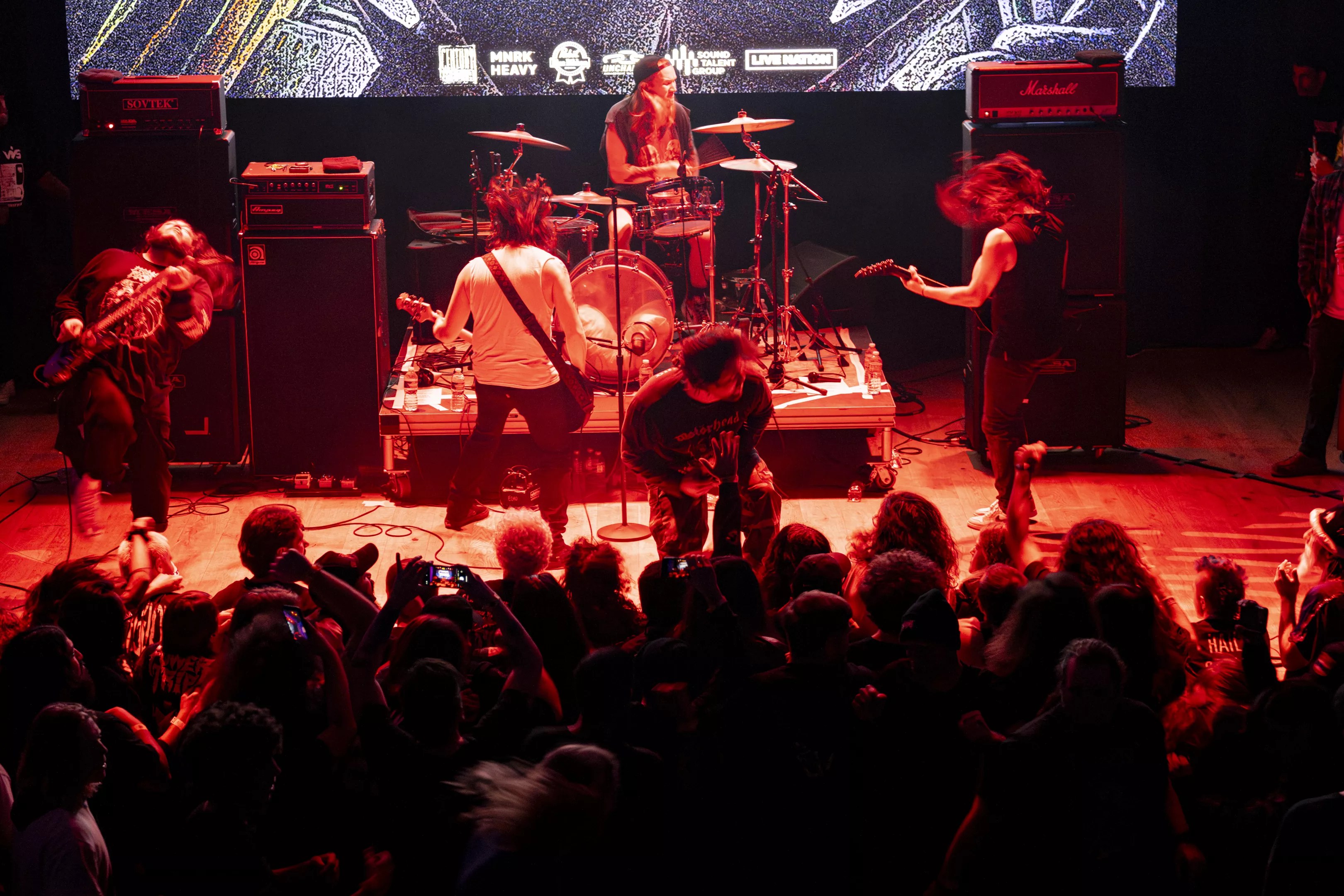 The kid in the wizard hat dives off the stage and disappears into the choppy sea of metalheads below. Devil-horned hands bob in the crimson-lit room as the crowd headbangs in unison. A circle pit kicks up again, forming a cyclone.