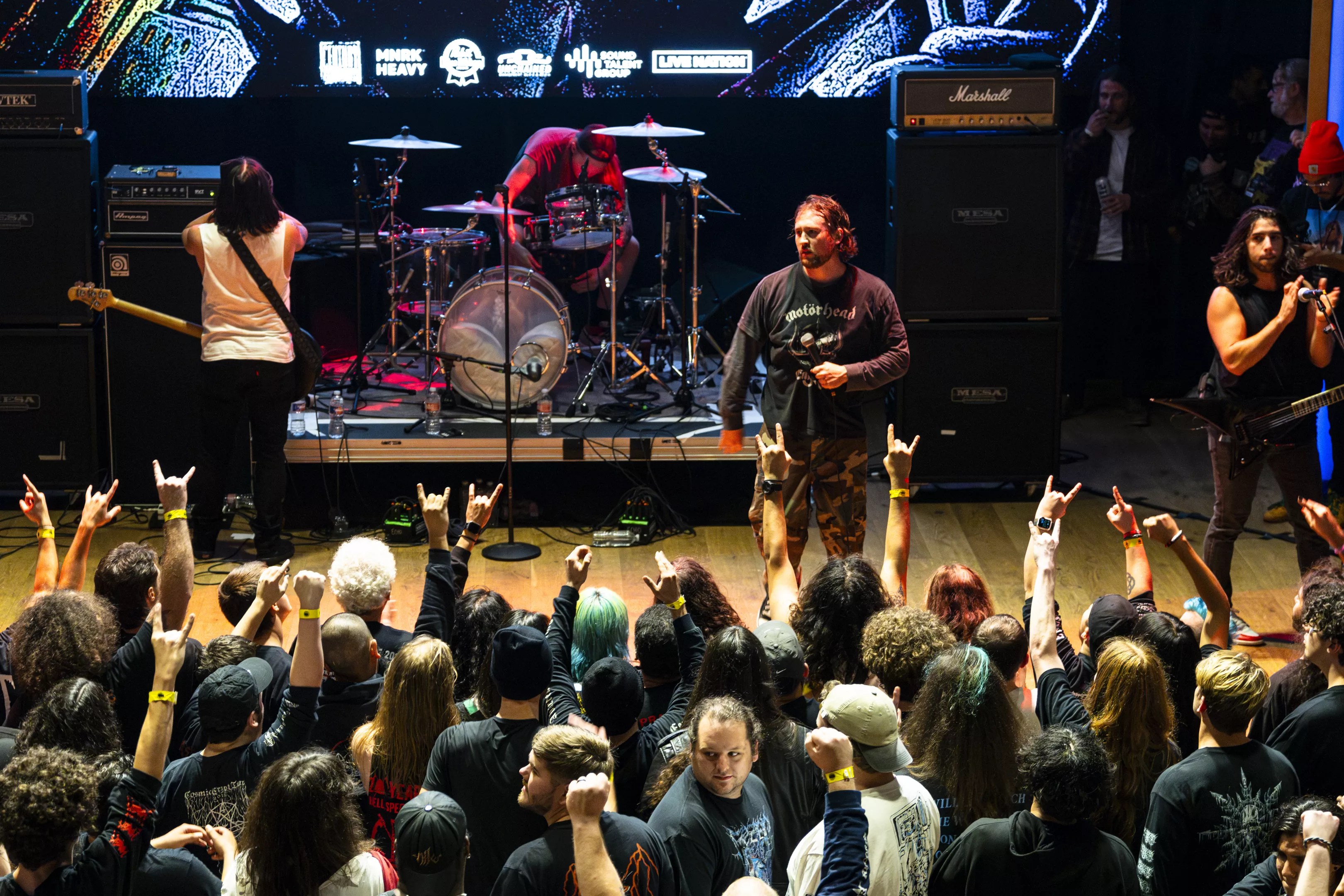 Black and silver beach balls soar through the air at Wrecking Ball Metal Madness, punctuated by a sinister riff. Frozen Soul vocalist Chad Green orchestrates a Magic: The Gathering match, directing the crowd to form a circle pit around the fantasy trading card game.