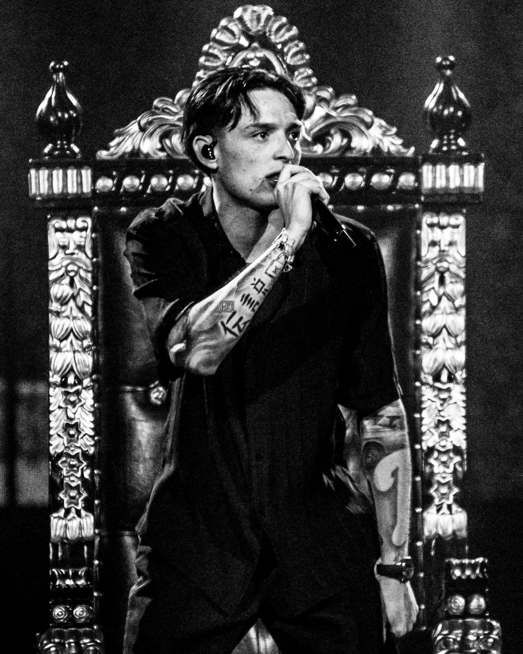 Peso Pluma sat most of the show due to an injury, at times on a throne.