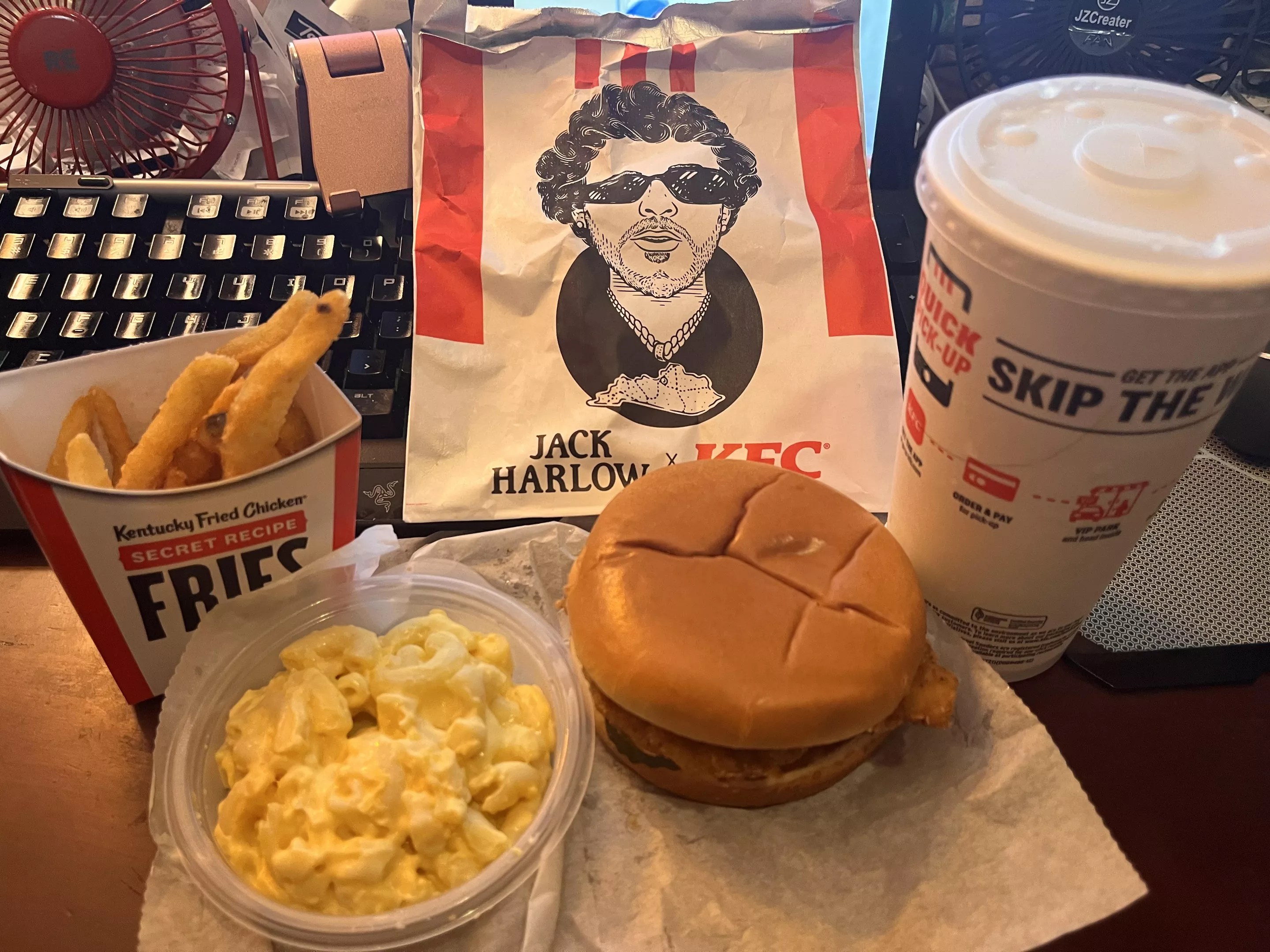 We ordered one to check it out. The meal consists of a KFC spicy chicken sandwich, a modest order of fries, a side dish of macaroni and cheese and a medium lemonade. It’s supposed to come with a cup of ranch dipping sauce but someone behind the counter didn’t put it in our bag, which is a shame because it’s the only thing that differentiates this meal from anything else in the menu. It’s listed on the drive-thru menu so it’s assumed it was supposed to come with it.