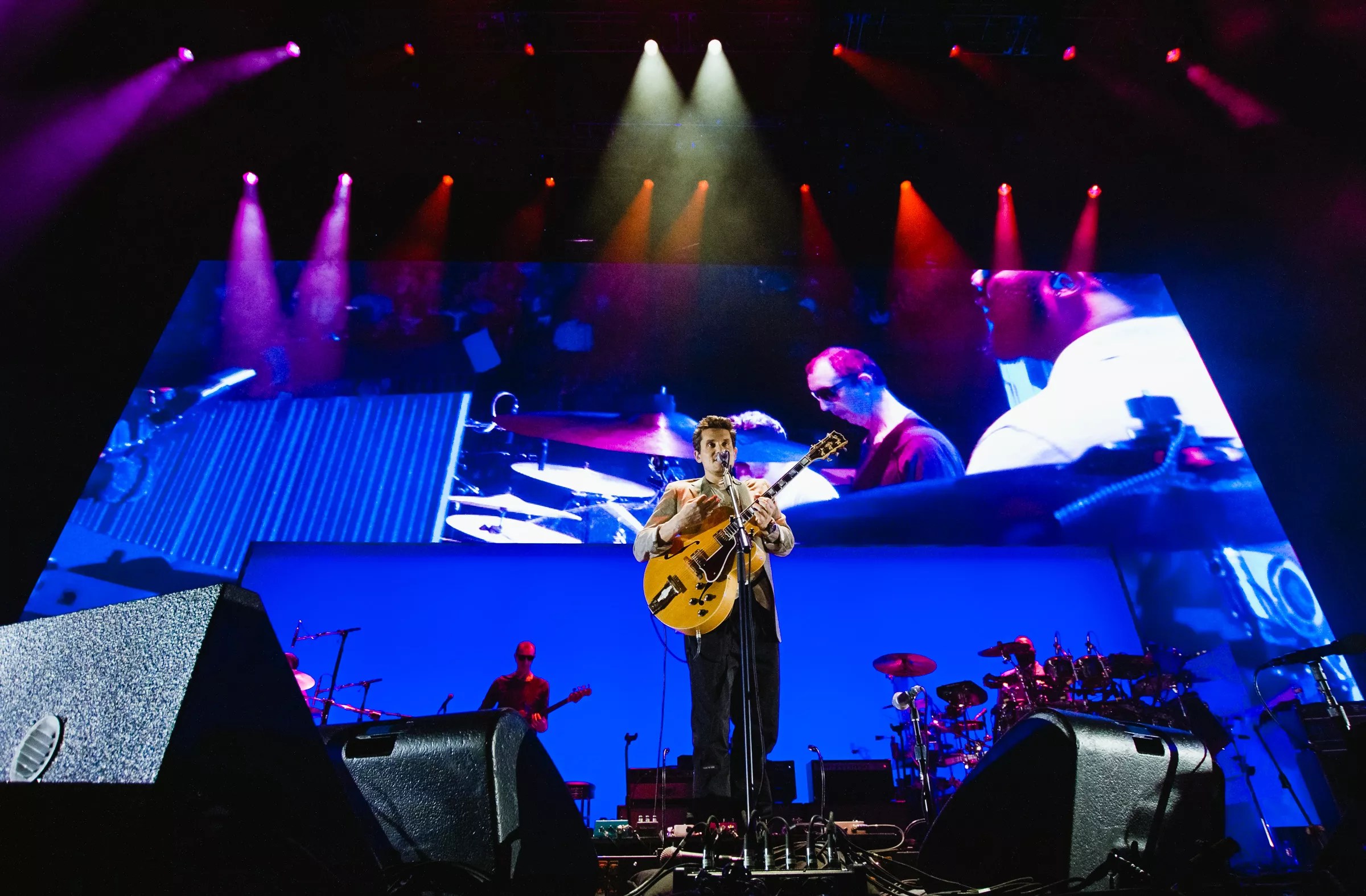 Time and again Thursday, Mayer would uncork a solo – his long fingers bending the strings of his electric or acoustic guitar in loving close-up on the enormous video screen, dwarfing the otherwise unremarkably dressed stage – stopping both time and your breath.