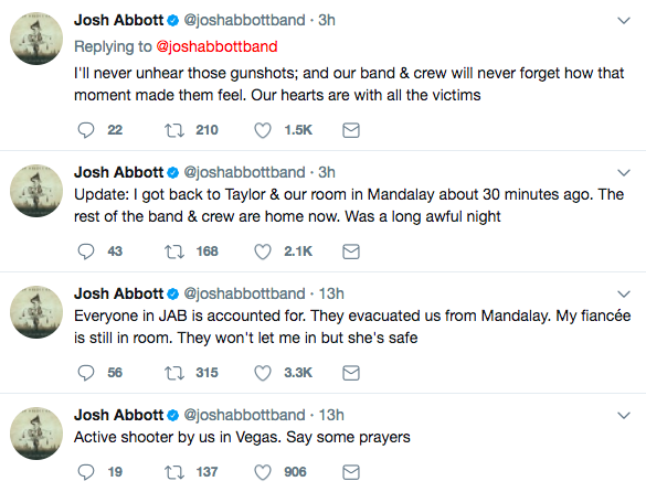 “Everyone in our band and crew are safe. I (Josh) had just left and was in the Mandalay Bay on the 20th floor with my fiancée during the shooting just a few floors away. The band & crew were on the concert grounds and saw people get shot,” the Facebook post read. “Some of my crew members were hit with shrapnel, but not injured. We are deeply disturbed by this horrific act of violence and send our thoughts and prayers to the victims and their families. It was a long awful night but we are blessed to be alive and healthy. Hug your loved ones tight.”