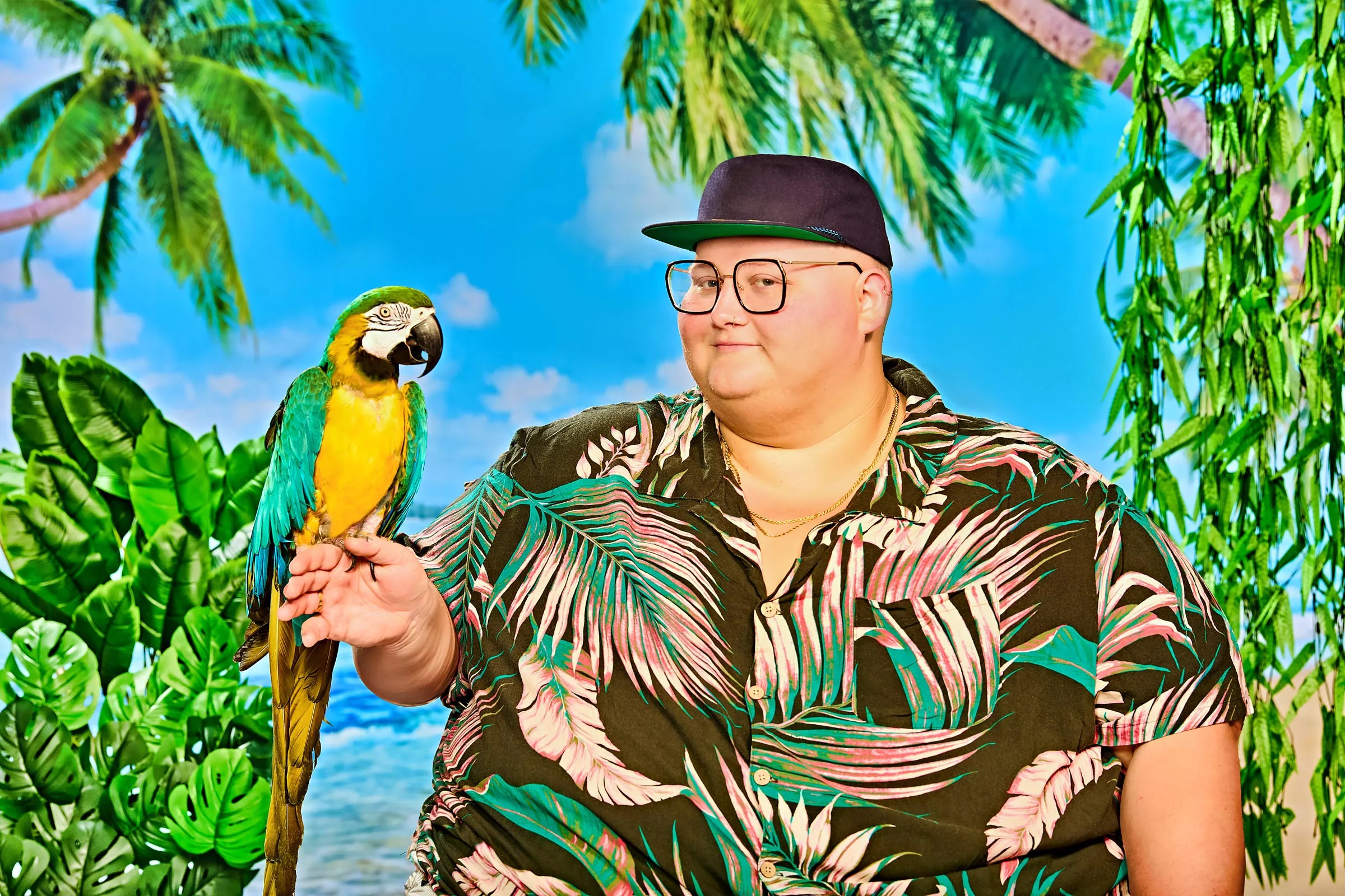 On the cover, Walker is photographed with a macaw named Thomas, laughing at the camera. “I think that was a nervous laugh that was captured,” he says, launching into a story about taking a family trip when he was around five to Rainforest Cafe in Corpus Christi. He took a picture with a macaw similar to Thomas at the restaurant, a ’90s-style photo opp that caused distress when the bird bit his ear.