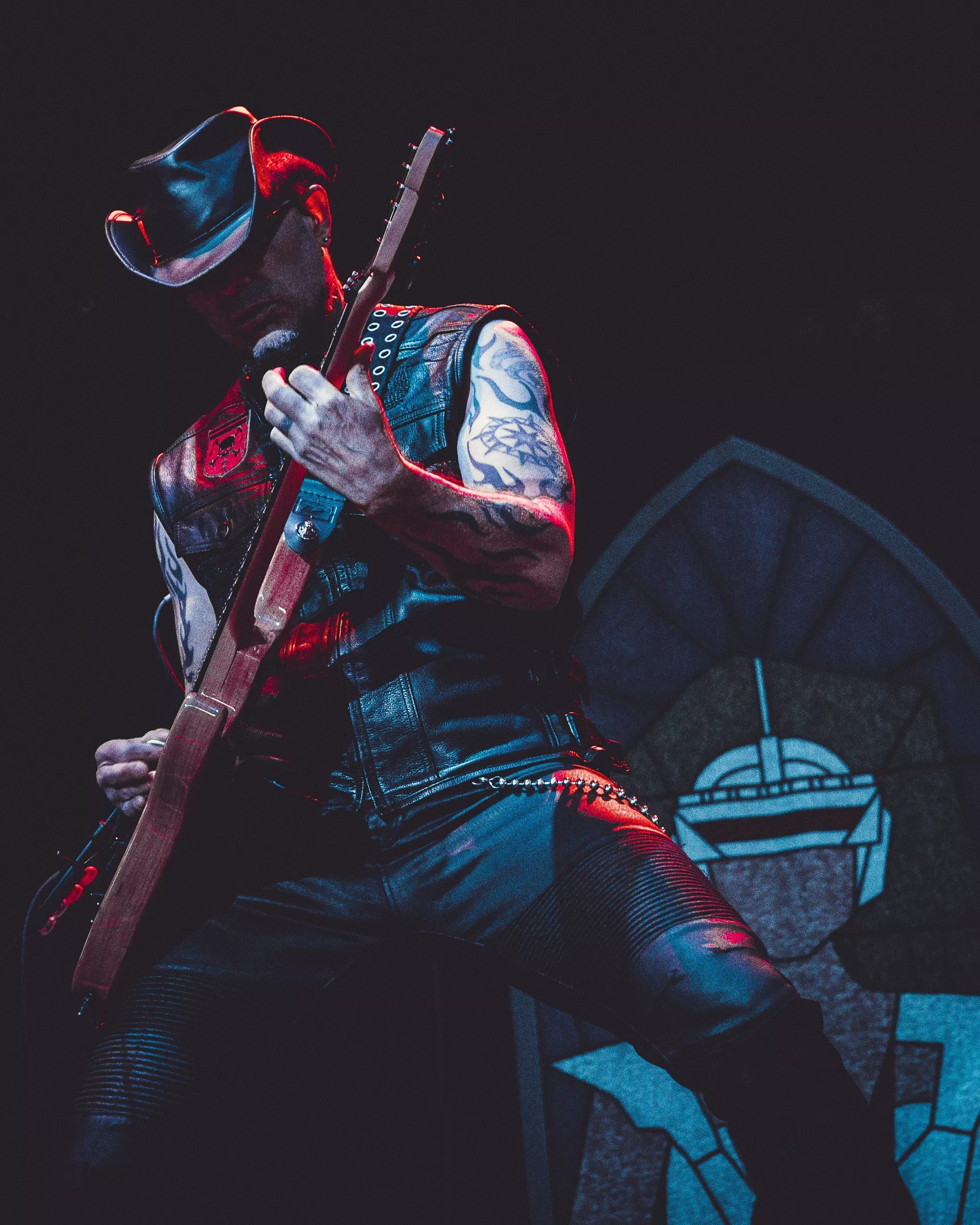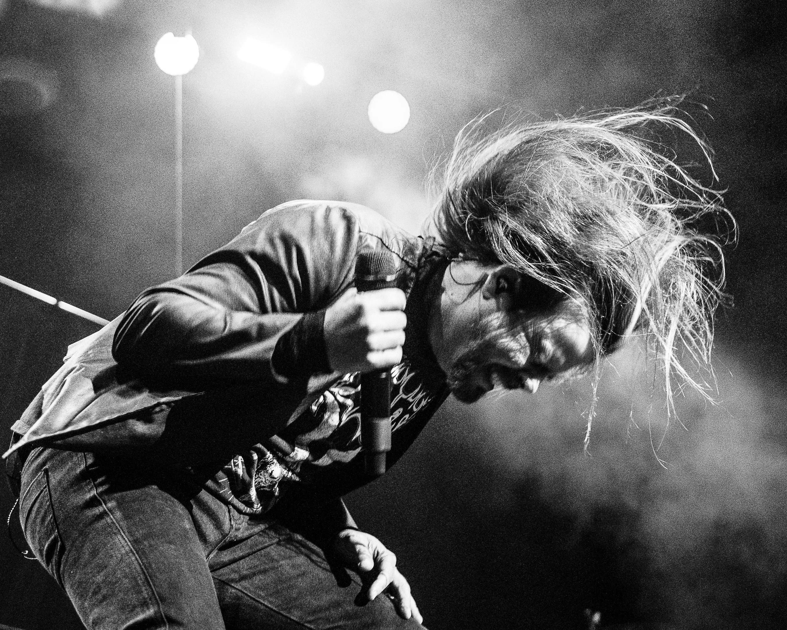 Playing after Queensrychye, Judas Priest started off with a heavy metal battle hymn as the four members took their spots in the metal factory that was the stage. Heavy billows of smoke emanated from the smoke stacks, lights flashed everywhere and the giant Judas Priest emblem illuminated every fan’s face. No introduction was made; bandleader Rob Halford just ripped straight into “One Shot At Glory” from their 1990 album Painkiller.