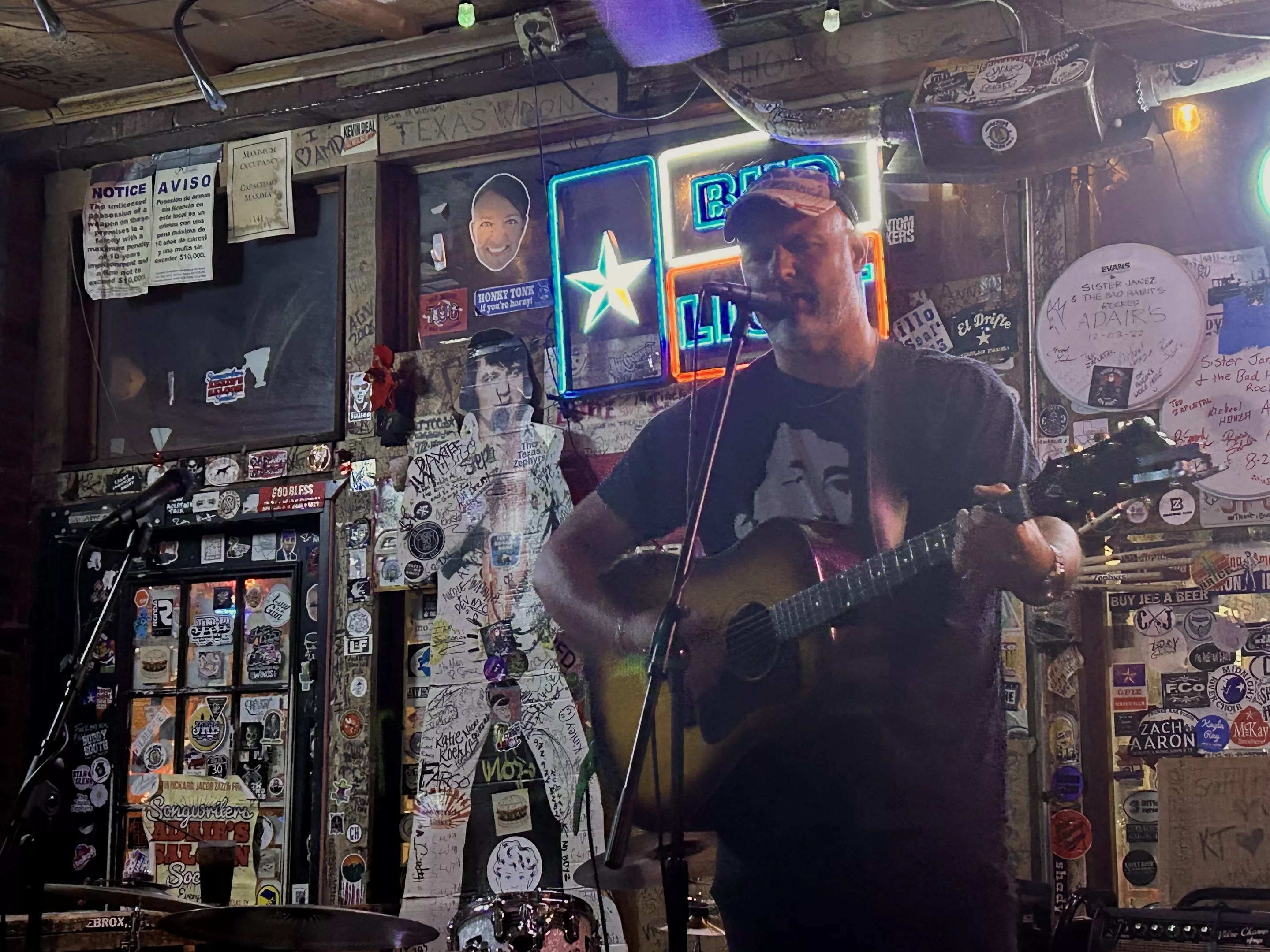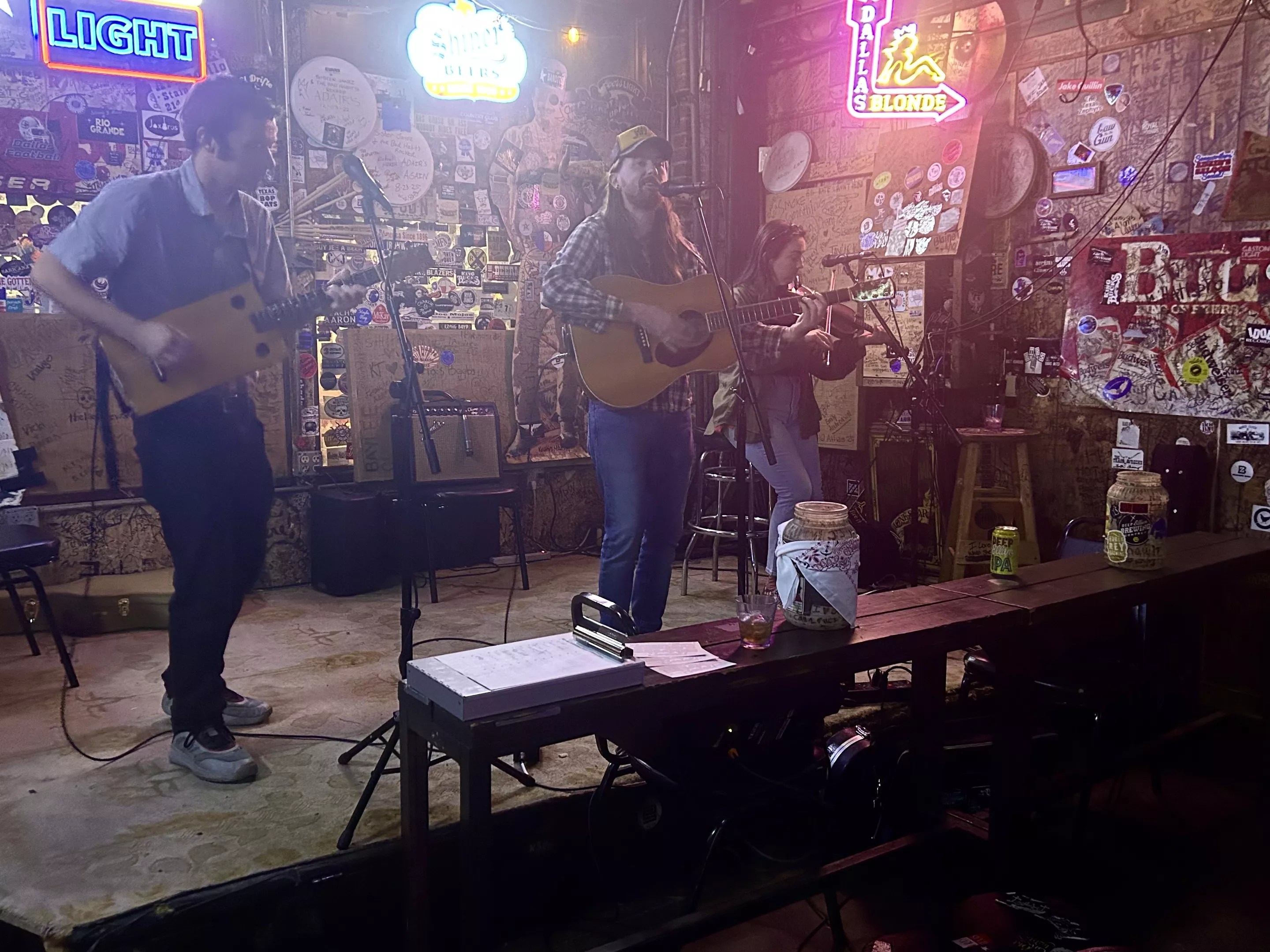 And the momentum hasn’t stopped. On this Tuesday night, it is quiet, and musicians are able to play four to five songs. But on the regular, it is capped at two to three songs due to the popularity of this event, even as it is largely unfamiliar to Dallasites who don’t frequent Deep Ellum. Every act gets applause, including resounding “whoops” from musicians who notice something fresh, as one guitarist plays with two capos at once. It is a safe space for people to try new things. Alice P. Zazz, who plays fiddle with Zazz’s band, recalls forgetting the words to her song a few weeks prior while experimenting with a banjo. “It’s all fun,” she shrugs. “This is a good place to do that.”