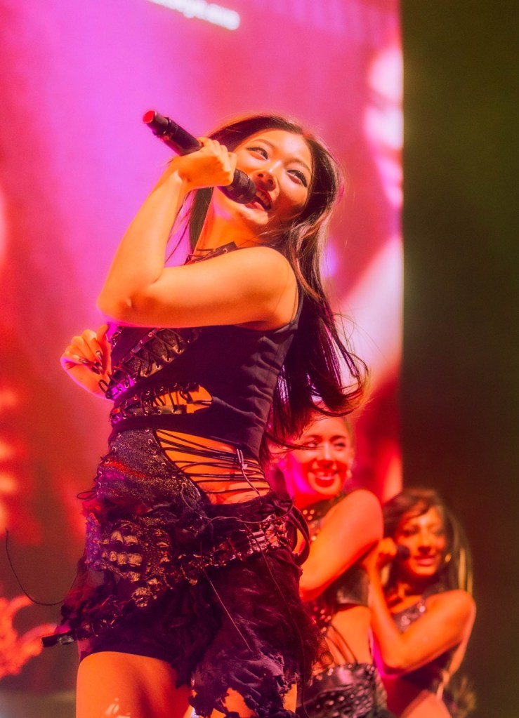 Fans wave their lightsticks to match the contemporary R&B and mid-tempo beats of “I’m Pretty” and “Mean Girls.” What shines throughout both of these and the following track, “Tonight I Might,” is the members’ playfulness and perceived comfort level on stage. It’s a switch-up compared with some of the understandably stressed personas seen in Netflix’s Pop Star Academy, which provided a behind-the-scenes glimpse into their experiences during the survival show. Sunday, the artists, in all their wide-eyed, newfound stardom glory, flash toothy smiles at fans and run up stairs with a giggle to join their colleagues center stage.