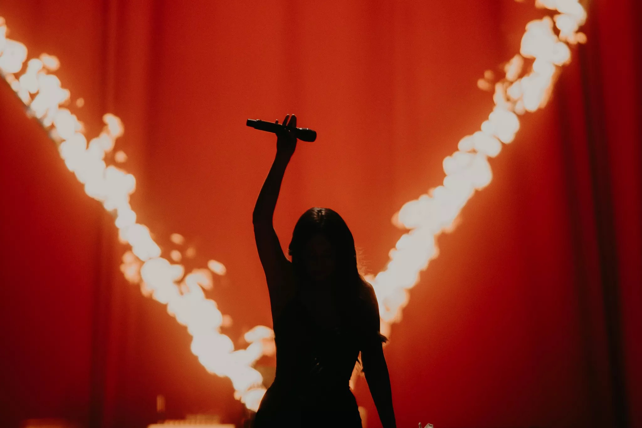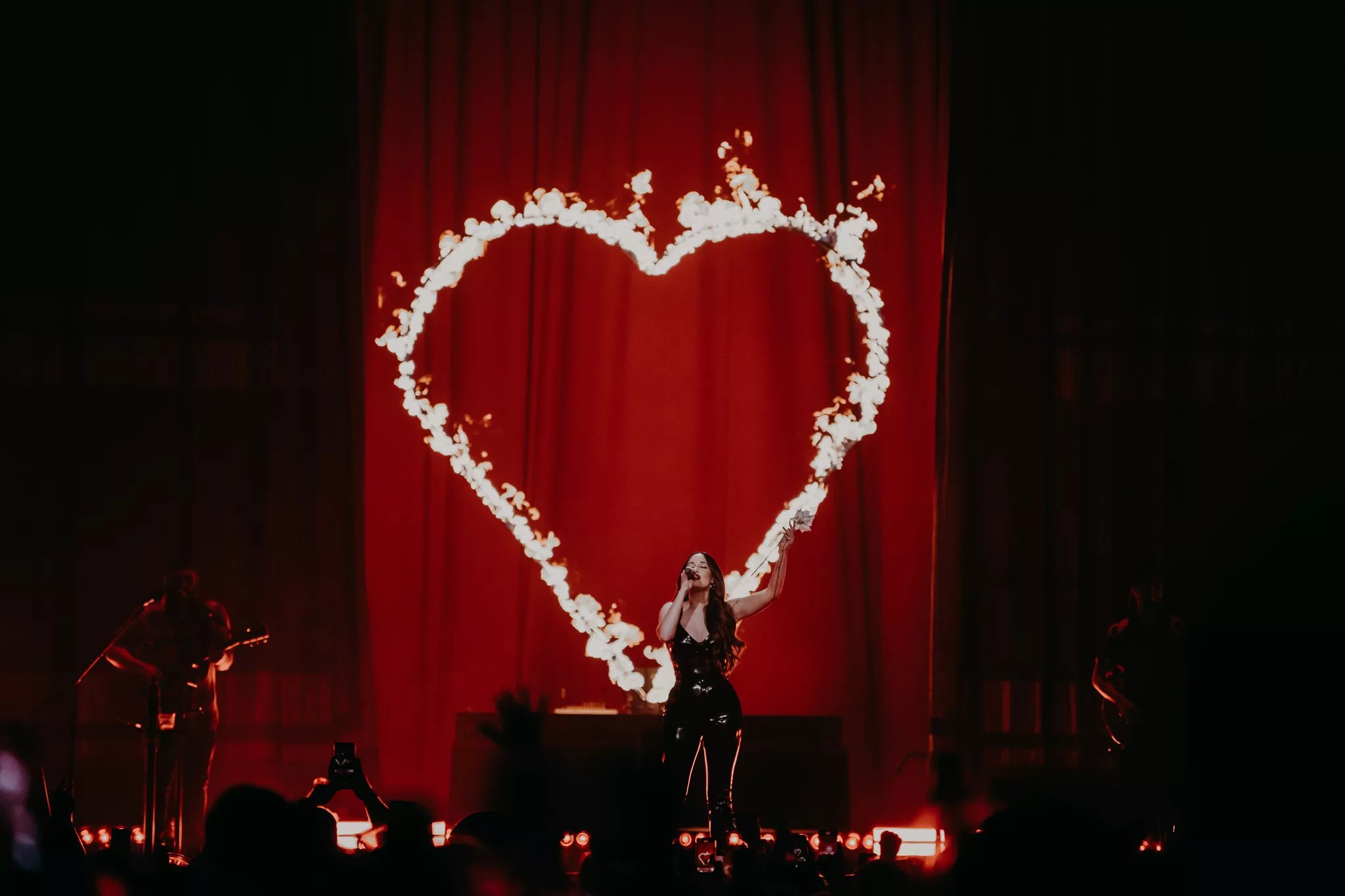 As Musgraves emerged from a blinding white light between the enormous scarlet curtains to begin the show, singing “star-crossed,” a literal flaming heart materialized behind her. She stood upon a heart-shaped LED screen at the foot of the expansive stage, outfitted with a grand proscenium, her seven band members surrounding her. A disco ball near the back of the arena floor striated the room with light during a hypnotic “Space Cowboy.”