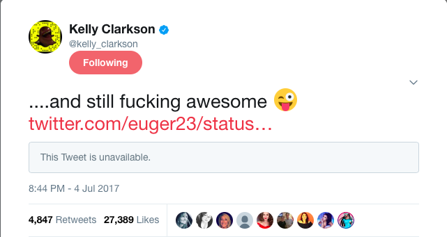 The hateful tweet that just said “you’re fat” was in response to a tweet Clarkson, 35, made July 4 in support of America’s troops. The original American Idol winner and Fort Worth native was quick to tweet back “…and still fucking awesome” to her critic, who has since deleted his or her comment.